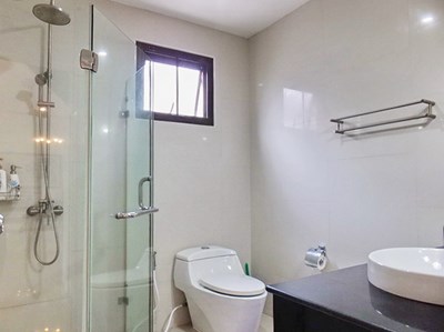 Separate shared bathroom with glass shower cubicle and rainfall-type shower