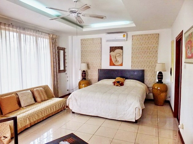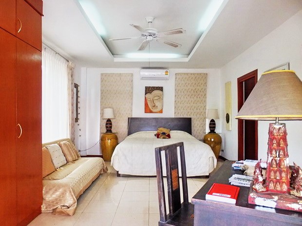Master bedroom suite with full bedroom furniture, built-in wardrobes, sofa, office area with desk and chair