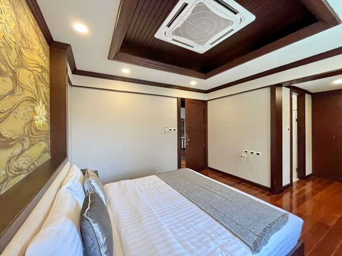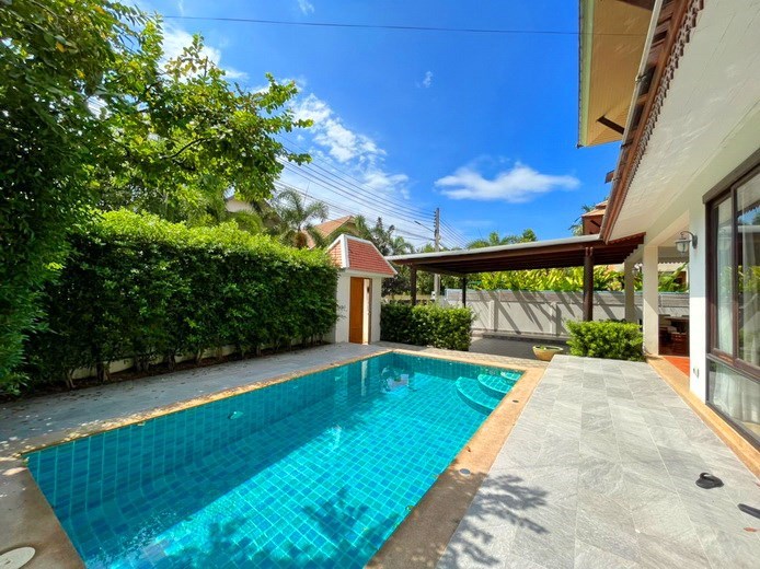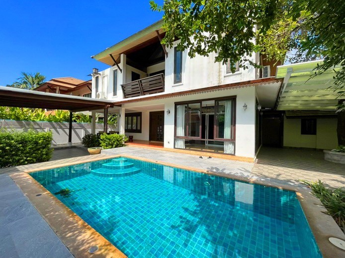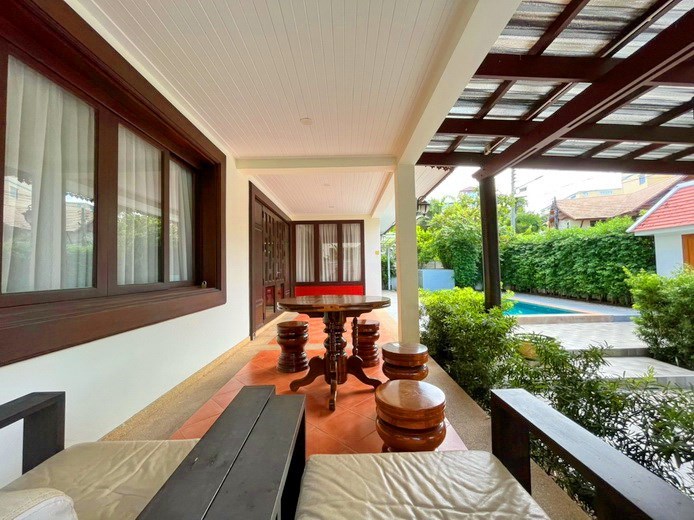PATTAYA REAL ESTATE: Pool villa for rent in Central Pattaya, land size 384 sqm, usable area 250 sqm approx., 3 bedrooms, 3 bathrooms, 2 additional rooms on the balcony, European-style kitchen, Thai kitchen, fully furnished, 1 guest quarter or maid quarter, covered terraces, private swimming pool, close to the beaches, 24-7 Security