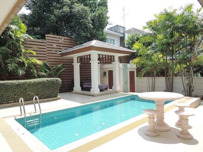 PATTAYA REAL ESTATE: House for rent Pattaya with private swimming pool, land size 492 sqm, living area 200 sqm approx., 3 bedrooms, 2+1 bathrooms, European-style kitchen, fully furnished, garden, private swimming pool, carport, maid's quarters, 24-7 security