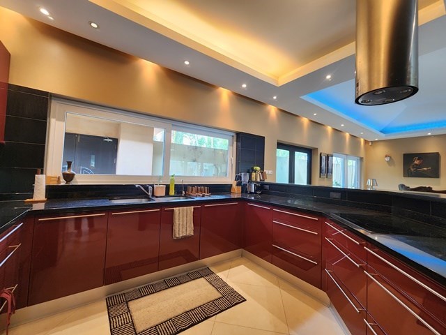 Luxurious kitchen with hi-gloss cabinets, hob, extractor hood, oven, microwave, fridge-freezer etc.