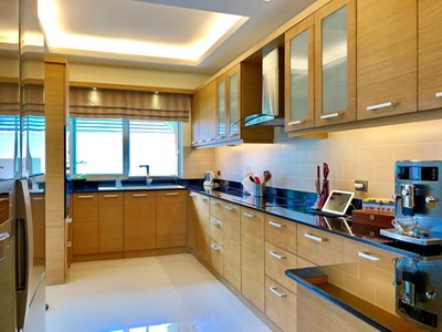 Designer European-style kitchen with kitchen cabinets, granite counter tops, hob with extractor hood, oven, microwave, large fridge-freezer