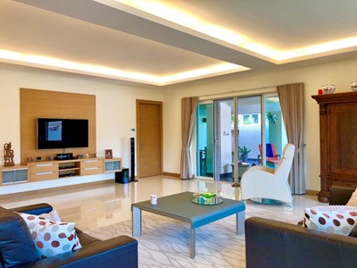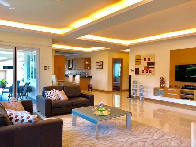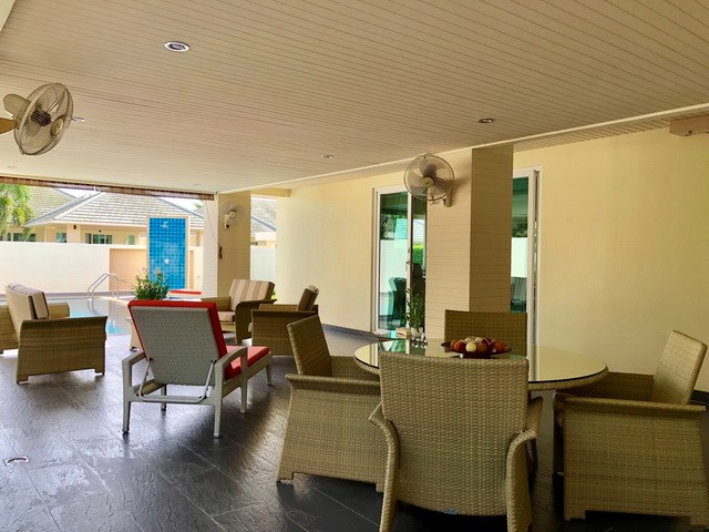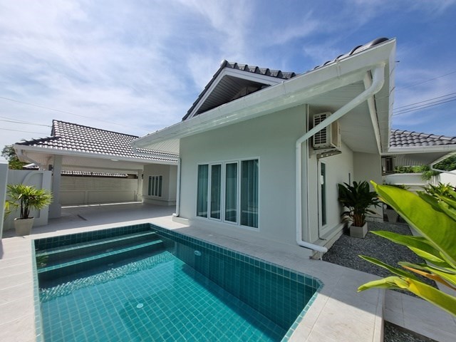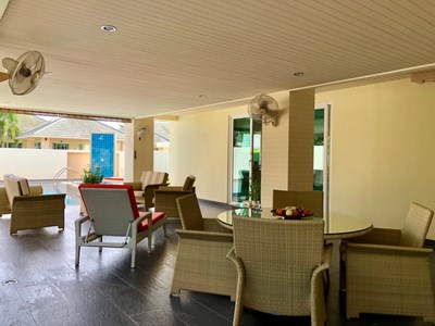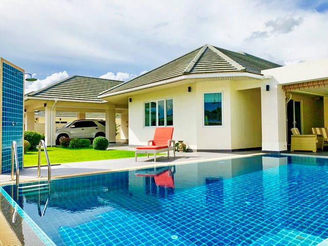 PATTAYA REAL ESTATE: House for sale East Pattaya with private swimming pool, land size 576 sqm, living area 200 sqm approx., 2 bedrooms, 2+1 bathrooms, European-style kitchen, fully furnished, Private Swimming Pool, lawned garden, large covered terrace, breakfast terrace, laundry room, Carport with automatic gate, 24-7 security