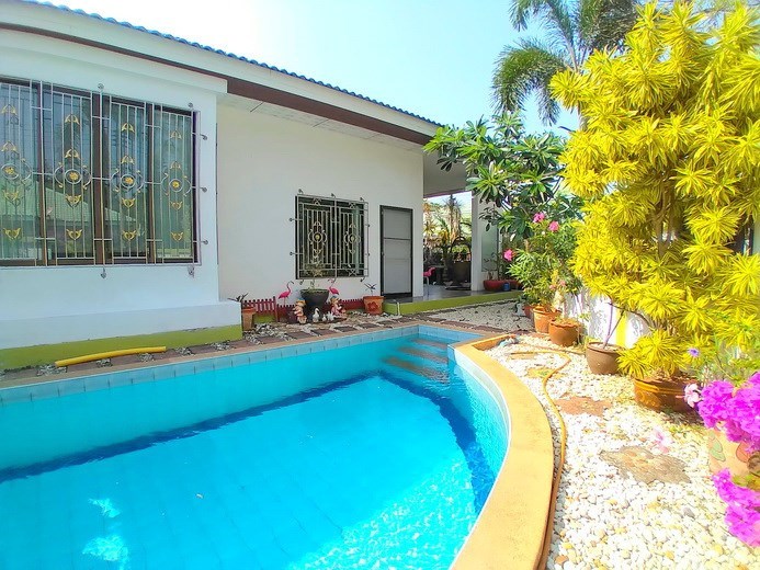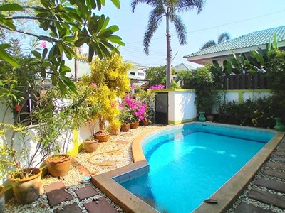 PATTAYA REAL ESTATE: Pool villa for sale Pattaya, land size 304 sqm, living area 150 sqm, 3 bedrooms, 3 bathrooms, fully furnished, private swimming pool, tropical garden, covered terrace, carport, 24-7 security