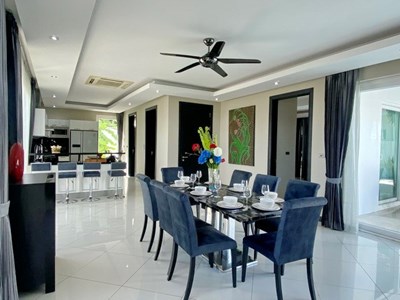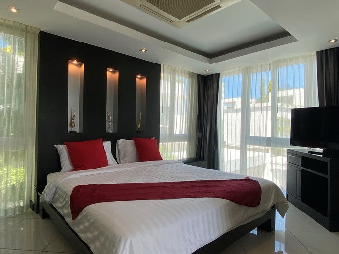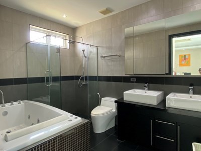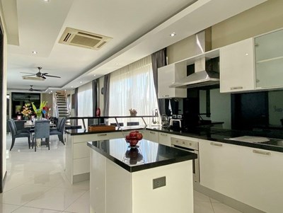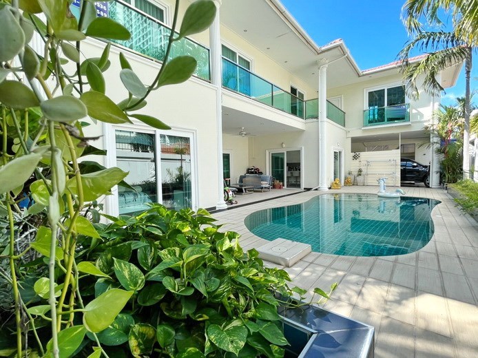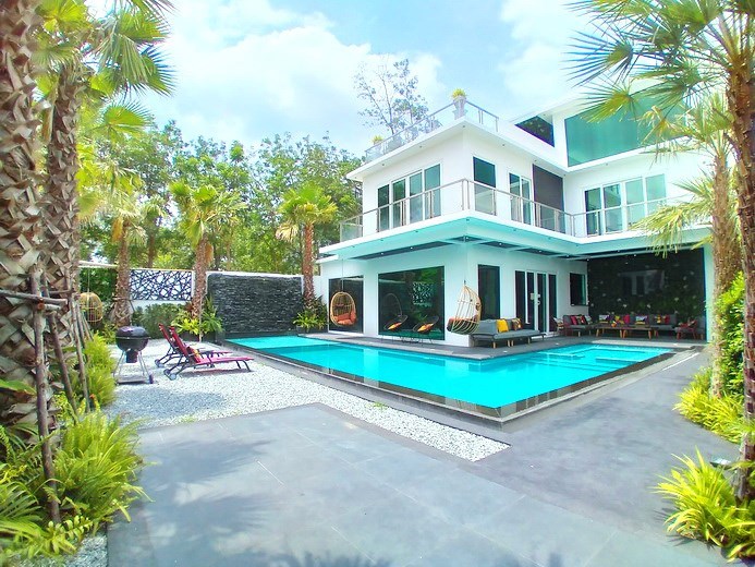 PATTAYA REAL ESTATE: Modern-style Luxury Thai Pool Villa for sale, land size 528 sqm, living area 500 sqm approx., 5 bedrooms, 5+1 bathrooms, European-style kitchen, landscape garden, private swimming pool, roof-top Jacuzzi tub, roof-top barbeque area, sauna, 24-7 security, close to Jomtien Beach