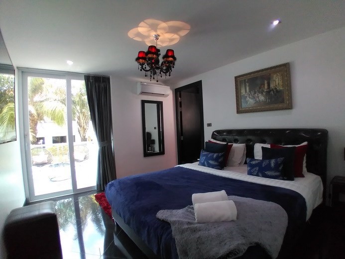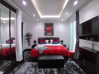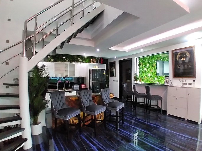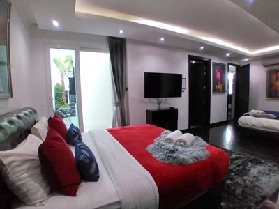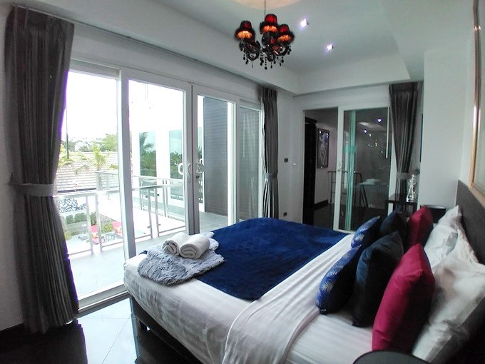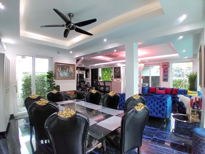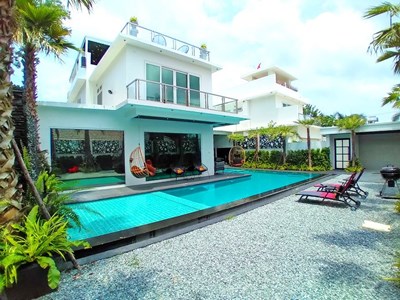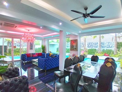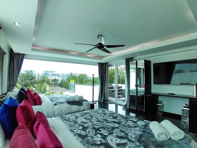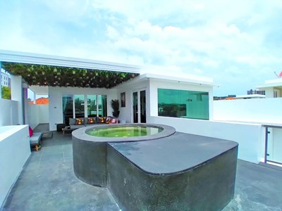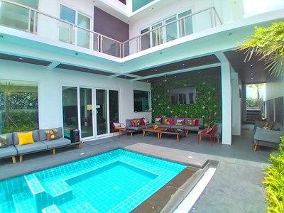 PATTAYA REAL ESTATE: Modern-style Luxury pool villa for sale, land size 436 sqm, living area 600 sqm approx., 8 bedrooms, 8+1 bathrooms, European-style kitchens, tropical garden, private swimming pool, roof-top Jacuzzi tub, roof-top area, 24-7 security, close to Jomtien Beach