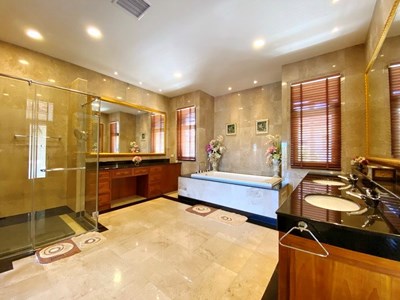 En-suite bathroom with separate Jacuzzi bathtub, glass shower cubicle, twin wash basins