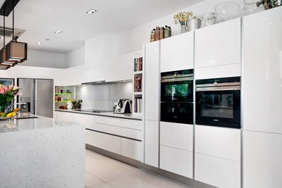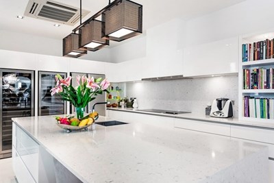 The modern kitchen, equipped with Siemens appliances, boasts every conceivable convenience, including three large wine cabinets.