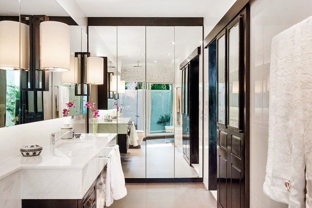 A fully equipped professional gymnasium, which can also serve as an additional bedroom, includes a bathroom and a sundeck with a tropical outdoor shower.