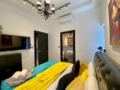 Second bedroom suite with bedroom furniture and wall-mounted flat screen TV.