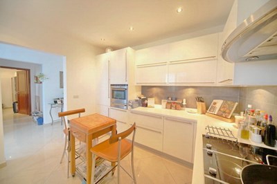 Separate U-shaped European-style kitchen that was custom-made with white kitchen cabinets, white work surfaces with sink and tiled splash-back, gas and electric hob with extractor hood, combined oven and microwave, thermostatically controlled heating drawer, and built-in fridge-freezer. All appliances are “name brands”.