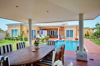 PATTAYA REAL ESTATE: Siam Royal View Detached Pool Villa for Sale, exclusive address, land size 754 sqm, internal living area 127 sqm, inside-outside covered living 375 sqm, 2+1 bedrooms, 3 bathrooms, Office, European-style kitchen, fully furnished, tropical garden, large covered terrace, Sala, Private Swimming Pool, alarm system, 24-7 security