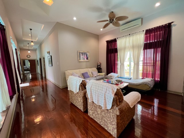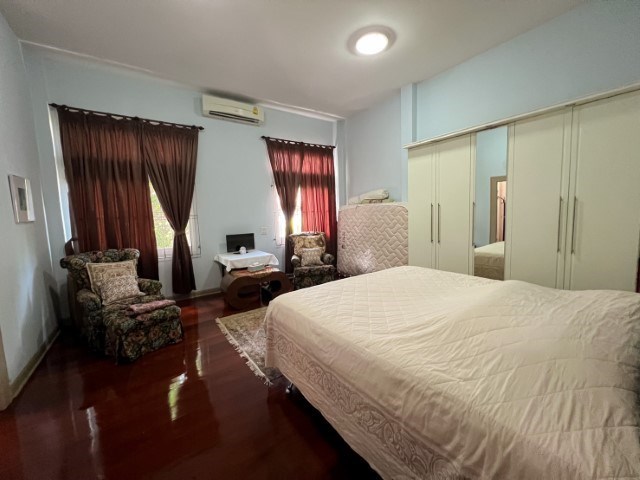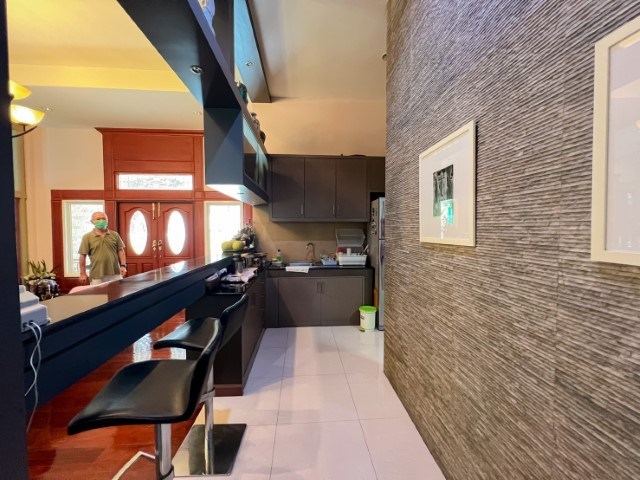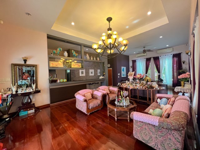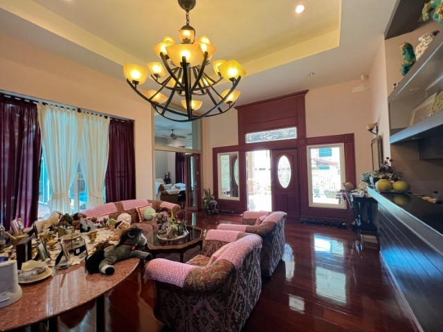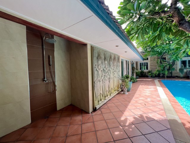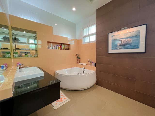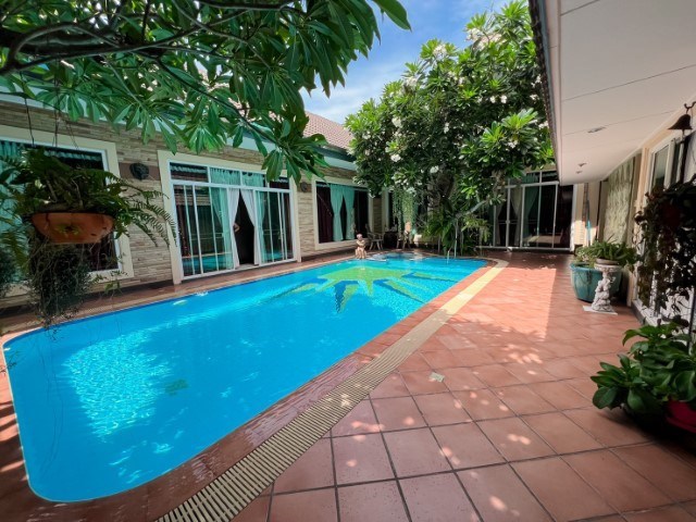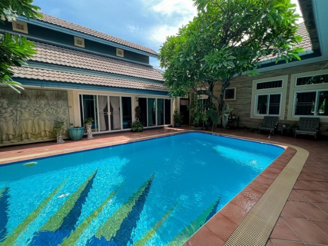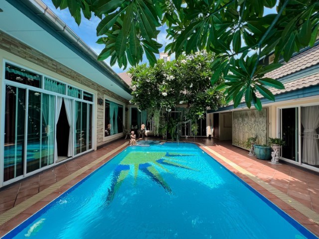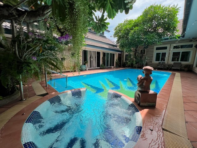 Family luxury house with large private swimming pool & jacuzzi. Land size 220 T.W. (880 Sq.m), living area 550 Sq.m. 1 storey with high ceiling, 3 bedrooms, 5 bathrooms, European Kitchen & Thai Kitchen, storeroom , maid room, 24 hour security, located at Jomtien area, just only 550 meter from Jomtien Beach