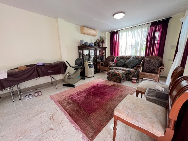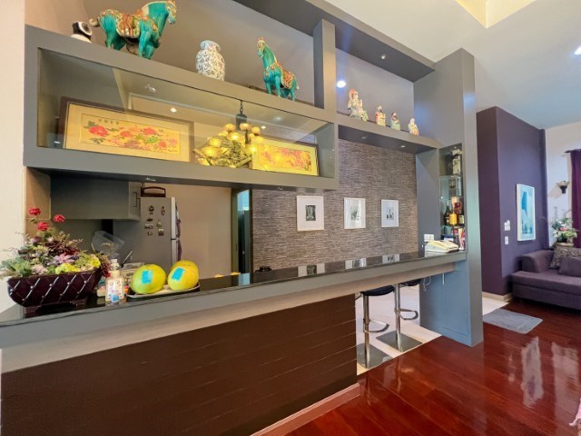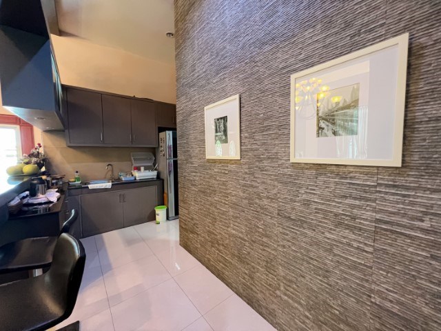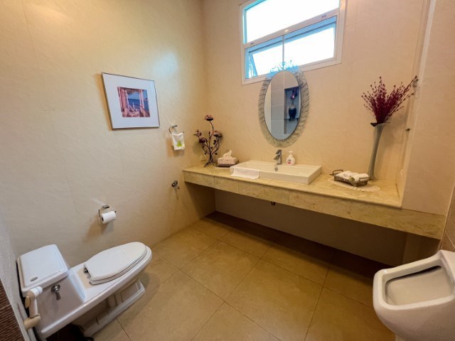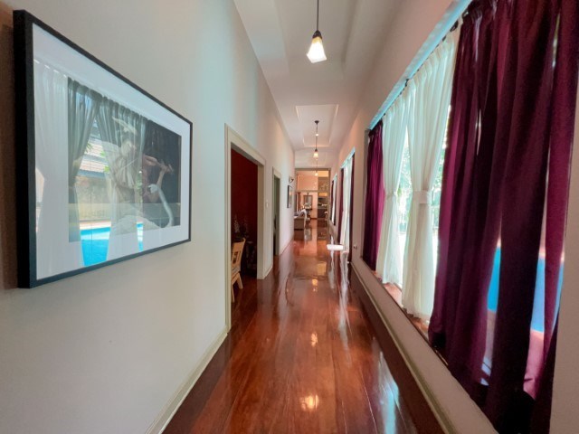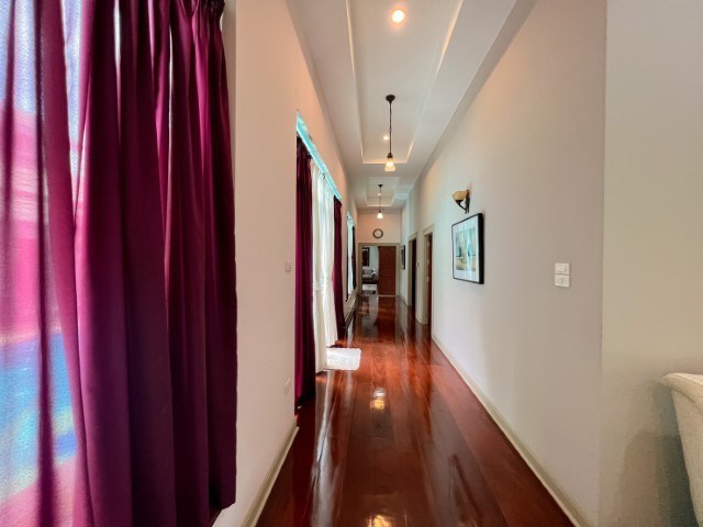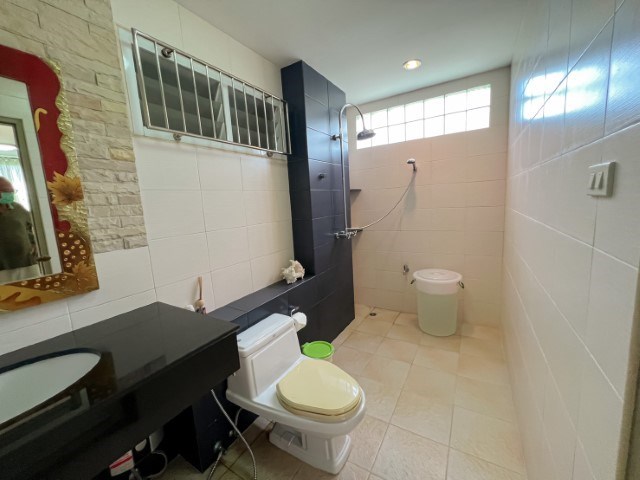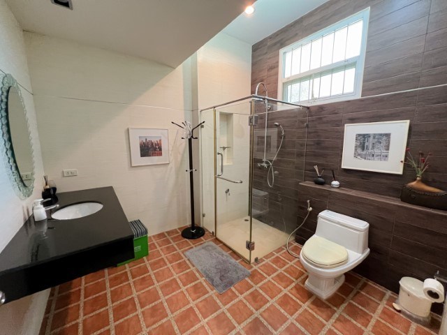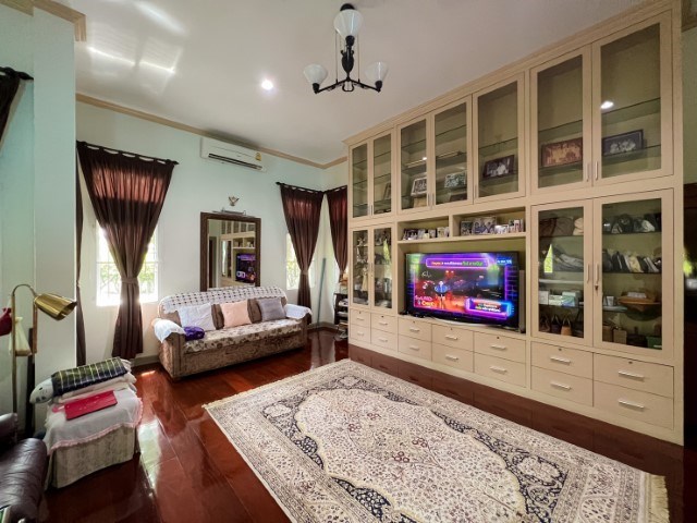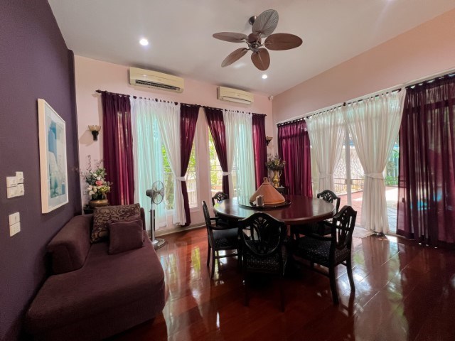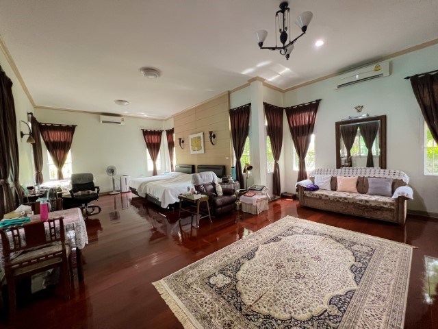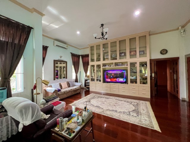 Family luxury house with large private swimming pool & jacuzzi. Land size 220 T.W. (880 Sq.m), living area 550 Sq.m. 1 storey with high ceiling, 3 bedrooms, 5 bathrooms, European Kitchen & Thai Kitchen, storeroom , maid room, 24 hour security, located at Jomtien area, just only 550 meter from Jomtien Beach
