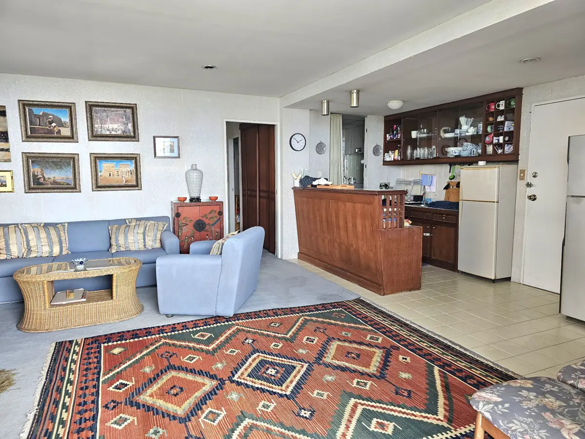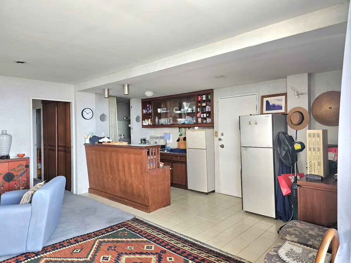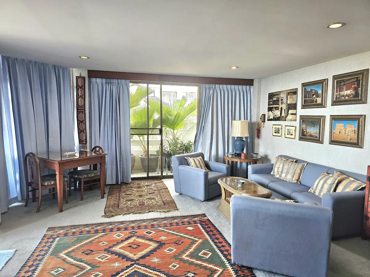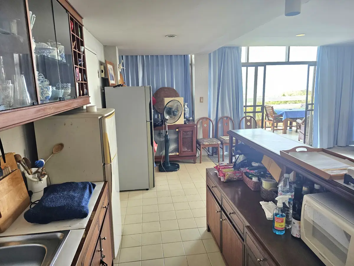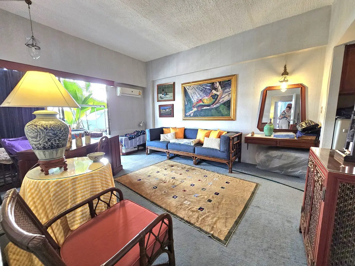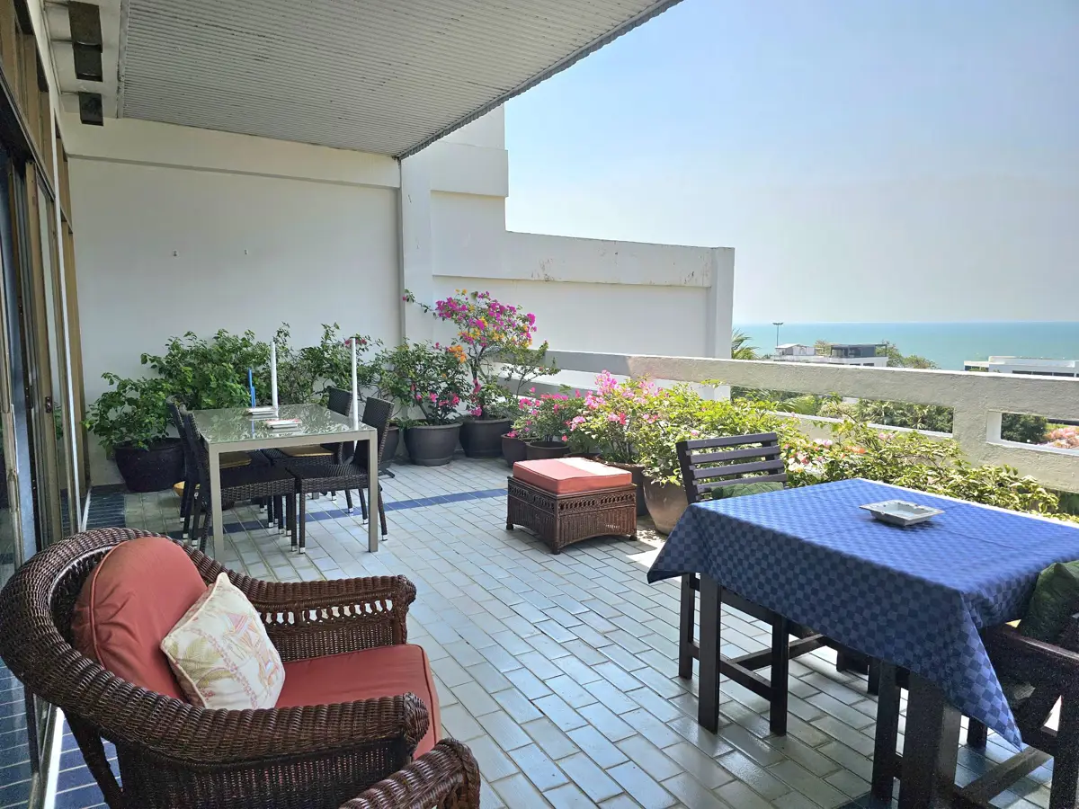 This rare corner unit at Jomtien Condotel offers stunning sea and garden views. The 151 sqm space includes 2 bedrooms (1 lounge), 2 bathrooms, and a large living area. Three connected balconies provide ample outdoor space, perfect for relaxing or entertaining.