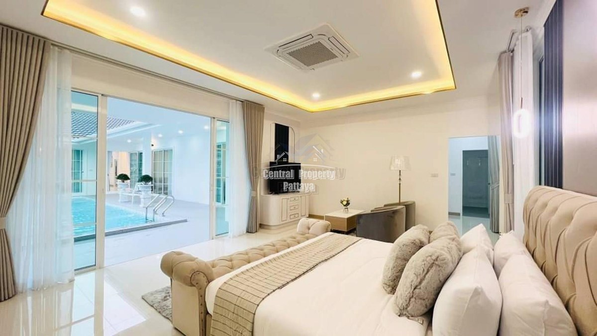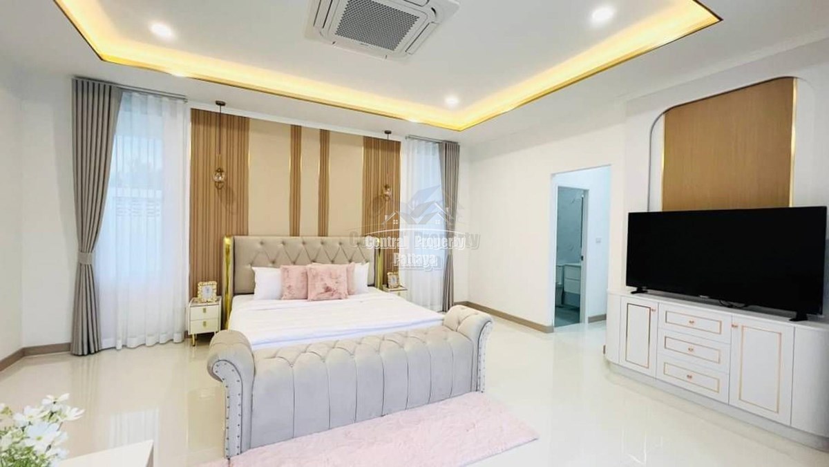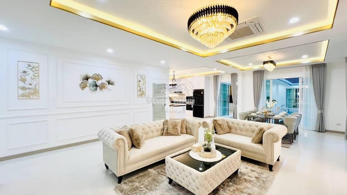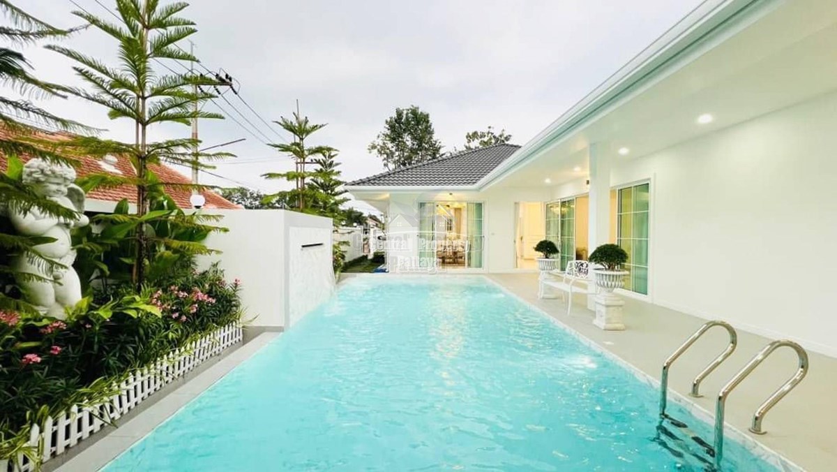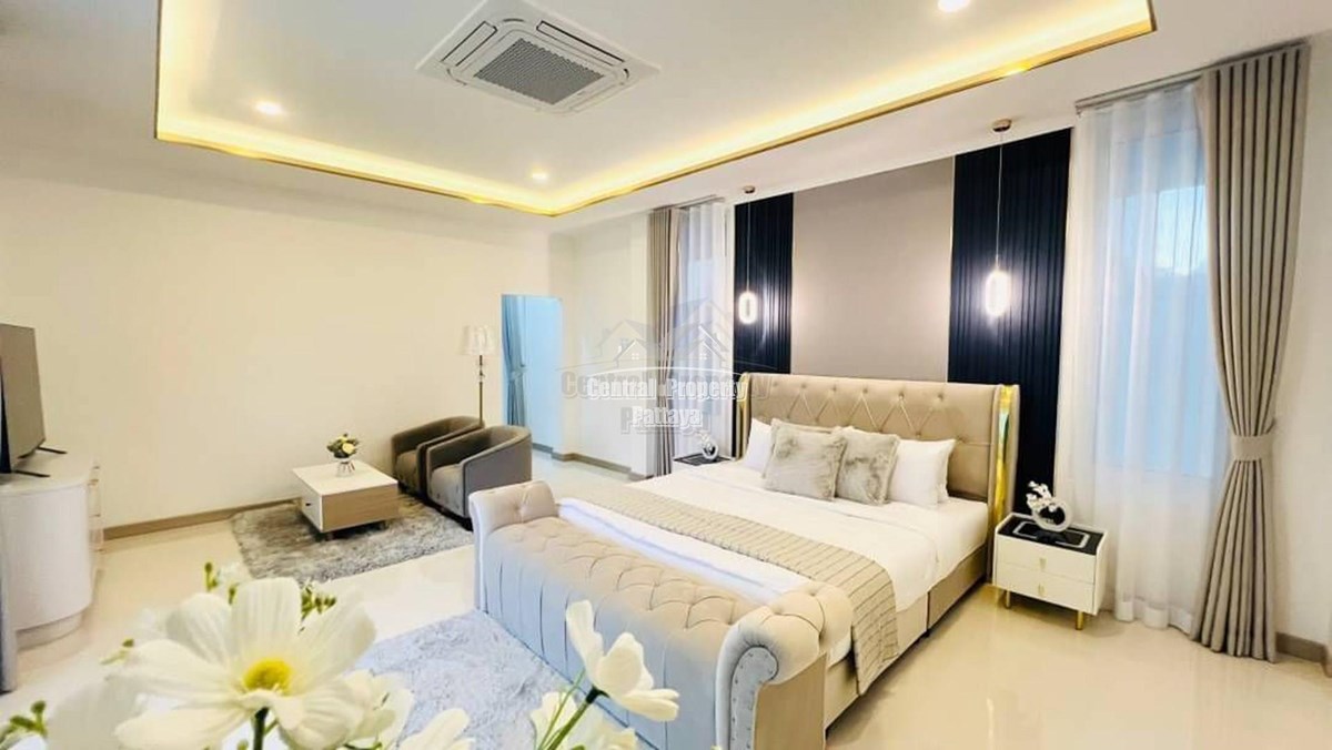 Since I cannot see images, I'll create a detailed description of a 600sqm pool villa with 5 bedrooms and 6 bathrooms. Feel free to provide additional details if you'd like me to incorporate specific elements from the picture. --- Luxury Pool Villa - 600sqm of Elegance and Comfort Welcome to this sprawling 600sqm luxury pool villa, a perfect blend of modern architecture and serene living. The villa boasts a large private swimming pool, surrounded by lush landscaping, offering an ideal oasis for relaxation or entertaining. Whether you're enjoying a refreshing dip in the pool or lounging by the water on the stylish outdoor furniture, the space promises an idyllic retreat. Interior Features: Five Spacious Bedrooms: Each of the five bedrooms is generously sized, filled with natural light, and designed with luxury in mind. The master suite features a king-sized bed, a private balcony overlooking the pool, and an en-suite bathroom with a large soaking tub and separate rainfall shower. Six Modern Bathrooms: The villa has six well-appointed bathrooms, with high-end finishes including marble countertops, double sinks, and walk-in showers. Each bathroom is thoughtfully designed to offer maximum comfort and privacy. Expansive Living Areas: The open-plan living area is the heart of the home, with high ceilings and elegant floor-to-ceiling windows that frame stunning views of the pool. A large sectional sofa invites guests to unwind, while the adjacent dining area features a custom wooden table that seats ten. Fully Equipped Kitchen: The state-of-the-art kitchen includes stainless steel appliances, an island with bar seating, and plenty of storage. It's perfect for both casual family meals and gourmet cooking. Home Theater/Entertainment Room: A cozy entertainment space, complete with a large screen and plush seating, is ideal for movie nights or watching your favorite sports. Outdoor Features: Private Pool: The large swimming pool is the focal point of the outdoor area. It’s surrounded by a sun deck with loungers, a shaded lounge area, and an outdoor shower for rinsing off after a swim. Garden and Outdoor Dining: The villa's landscaped garden features tropical plants, offering a peaceful escape. There’s also a shaded outdoor dining area, equipped with a BBQ grill, perfect for alfresco meals. Ample Parking: A private driveway with space for multiple vehicles ensures convenience for you and your guests. This villa is not only a place to live but an experience of luxury, privacy, and tranquility, ideal for families or groups looking for an unforgettable stay. Whether it’s relaxing by the pool or enjoying the beautifully designed interiors, this villa promises a lifestyle of elegance.