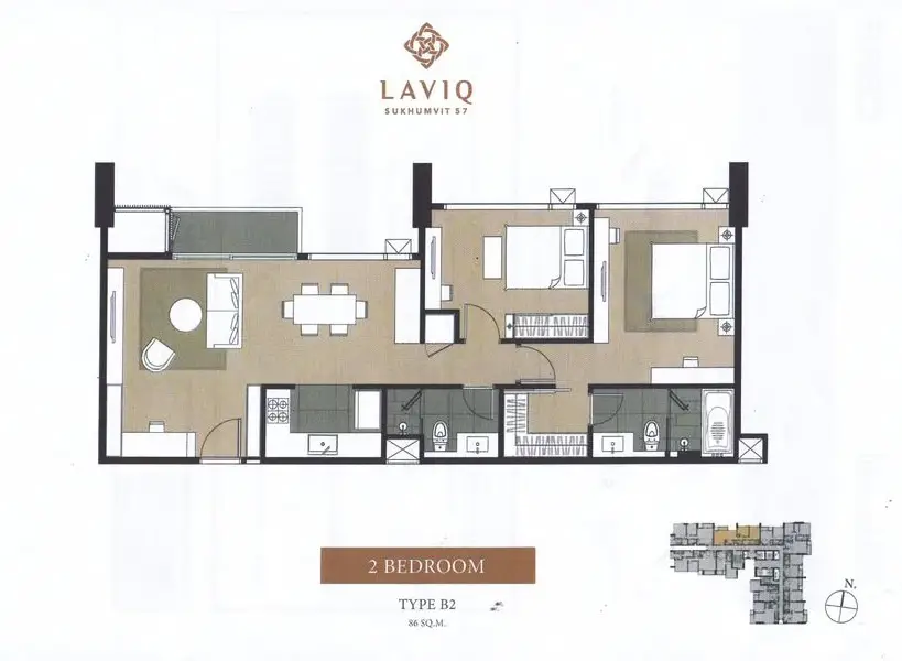 LAVIQ Sukhumvit 57 is an exclusive high-rise condominium developed by Real Asset Development Co., Ltd., located in one of Bangkok’s most prestigious neighborhoods, Thonglor (Sukhumvit 57). This luxurious project redefines urban sophistication, combining elegant design, high-end materials, and world-class facilities to create a truly exceptional residential experience. Now available to rent is this 2 bedroom, 2 bathroom condo. The property is fully furnished, is on the 23rd floor and measures 86 sqm.