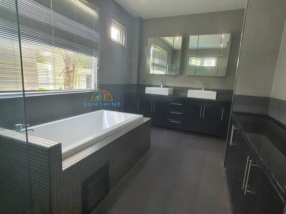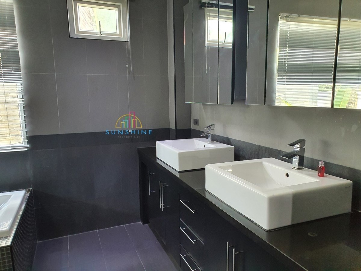 All three bedrooms have en suite bathrooms. There are glorious pool-views from two of the rooms. There are three bathrooms in total, one of which have bathtubs and all bathrooms have showers, western toilets and washbasins. The streamlined kitchen is very spacious and is ideal for self-catering. It has dining table, an oven, a refrigerator, microwave, an electric stovetops, a cooker hood and a toaster. The comfy sofas are great for lazing around on. The dining table looks out to the pool and ocean and can seat up to 6 guests. The outdoor terrace is also a great place for meals and relaxing and taking in the views. The garage is available for two car parkings.