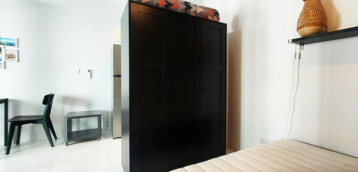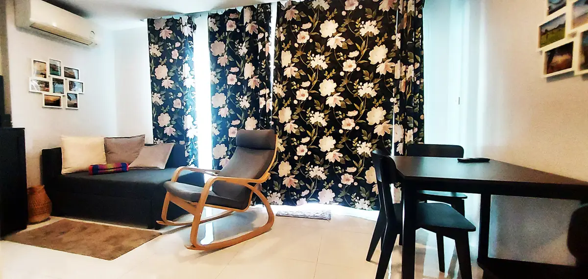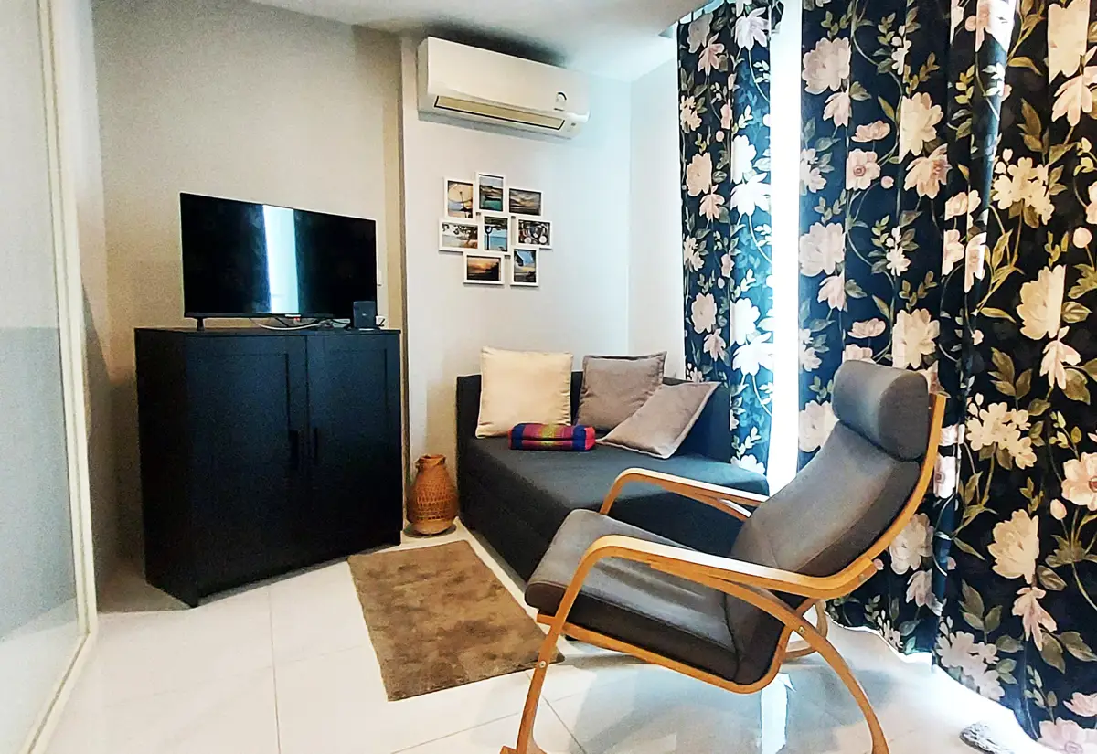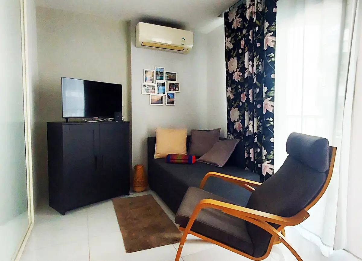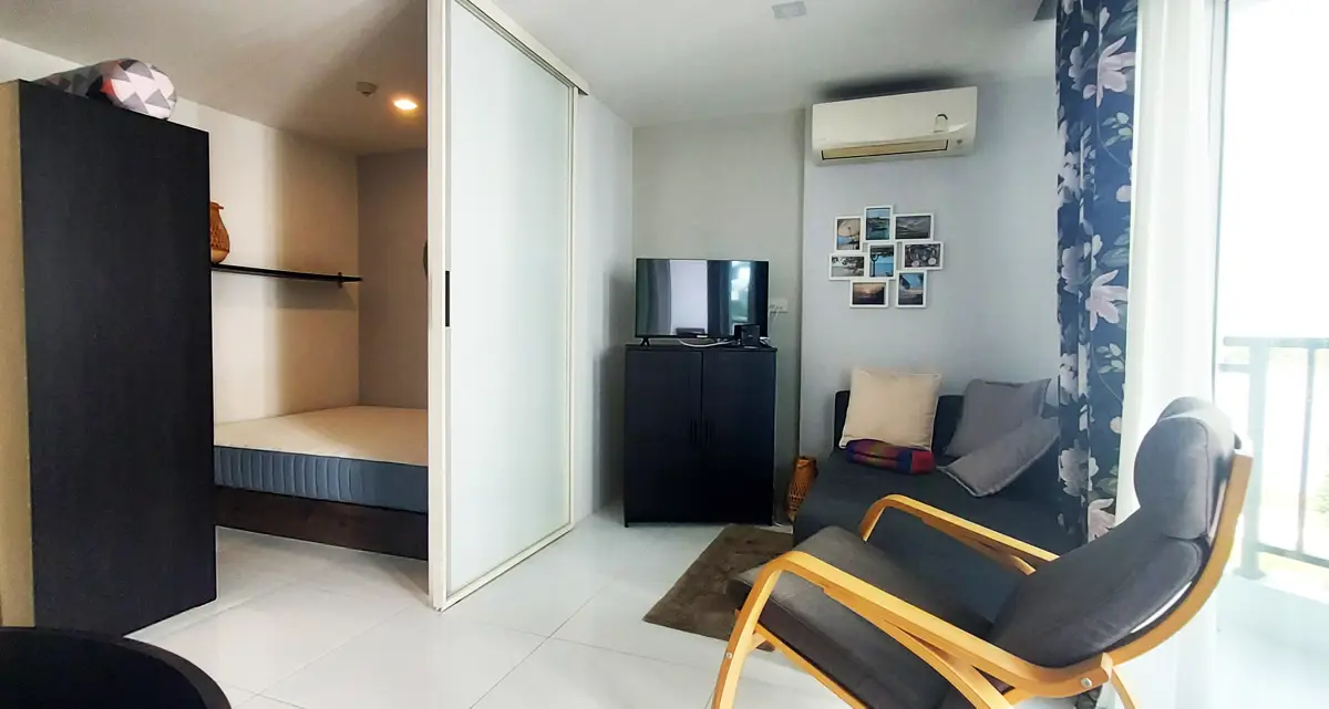 This condo on floor 4 has a living area of 32.32 square meters with a bedroom, a fully tiled bathroom, a living room and a kitchen area. The bedroom has two sliding walls/doors. Both the bedroom and the living room have air conditioning.