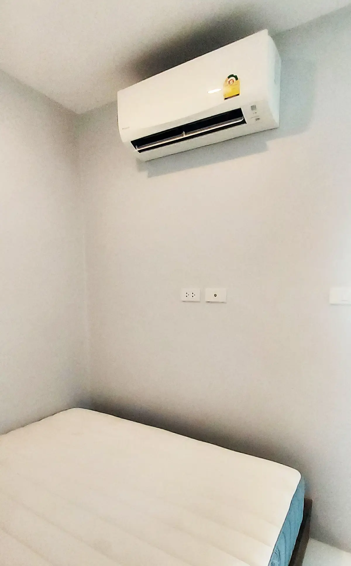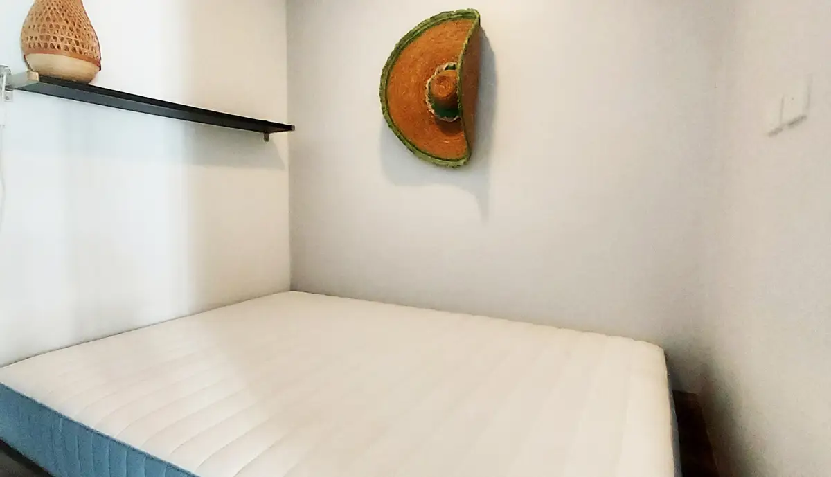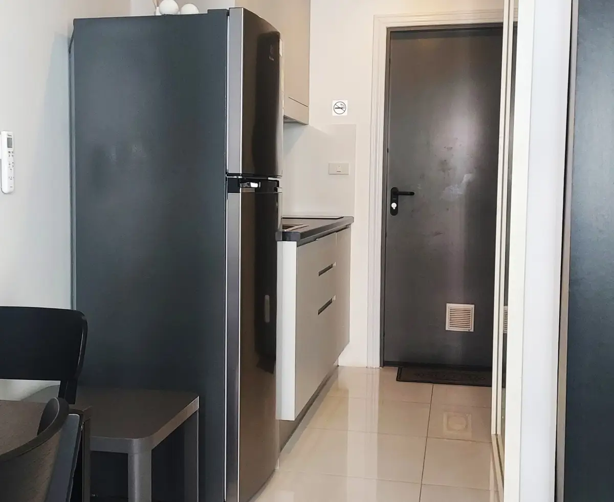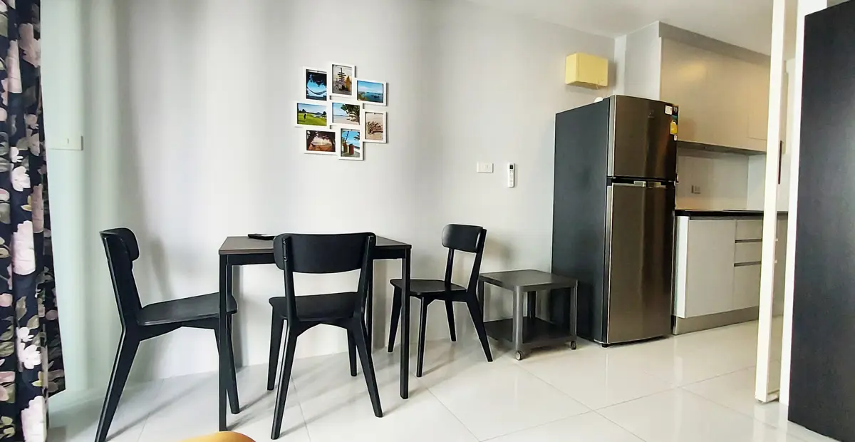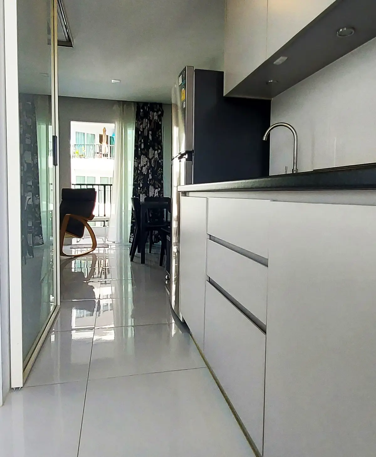 This condo on floor 4 has a living area of 32.32 square meters with a bedroom, a fully tiled bathroom, a living room and a kitchen area. The bedroom has two sliding walls/doors. Both the bedroom and the living room have air conditioning.