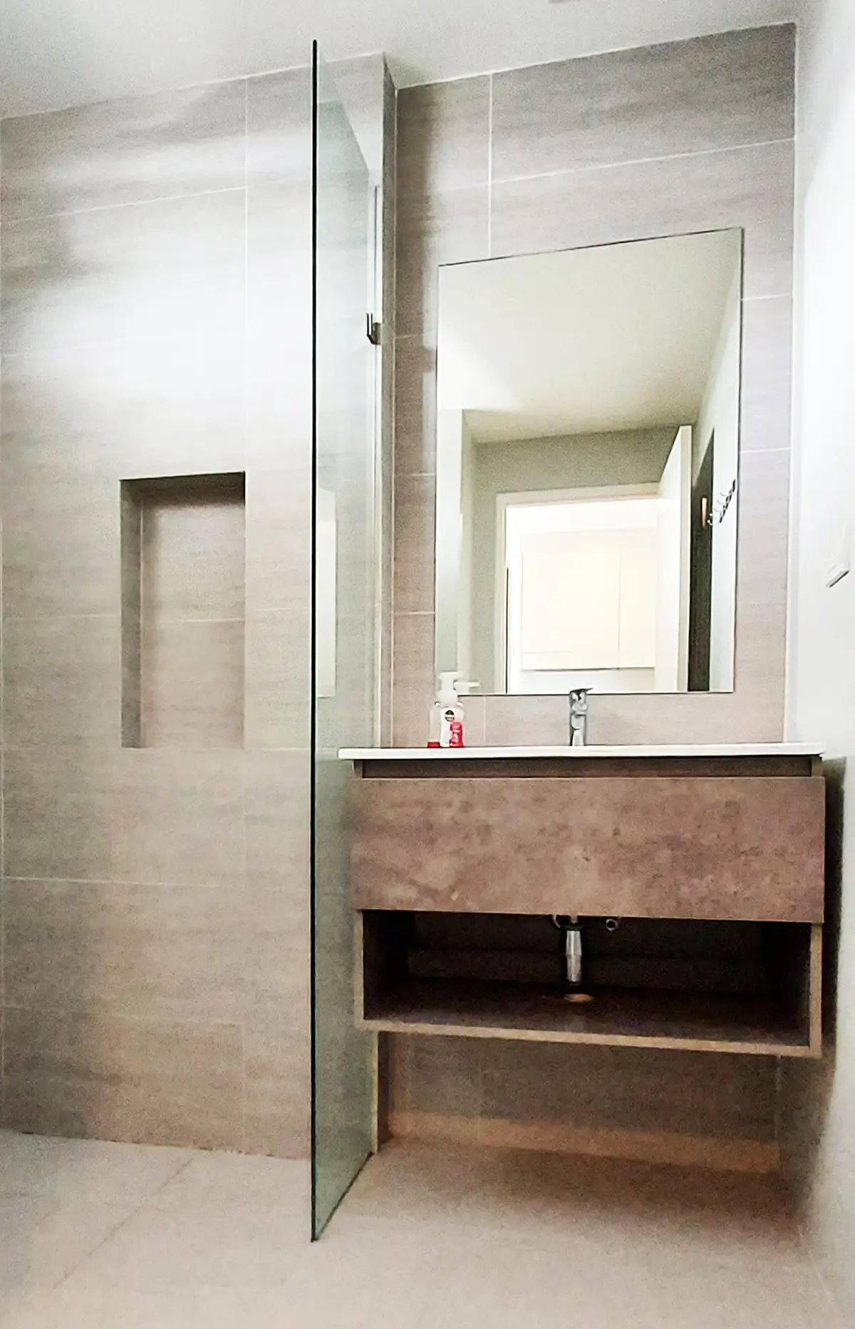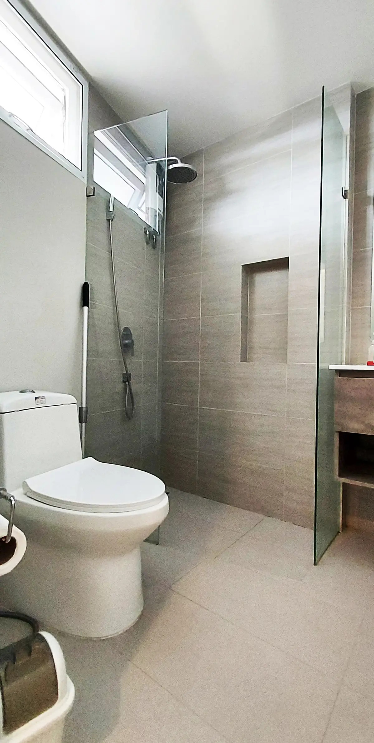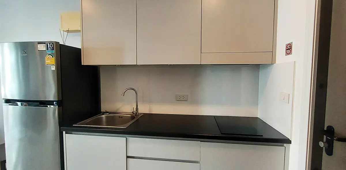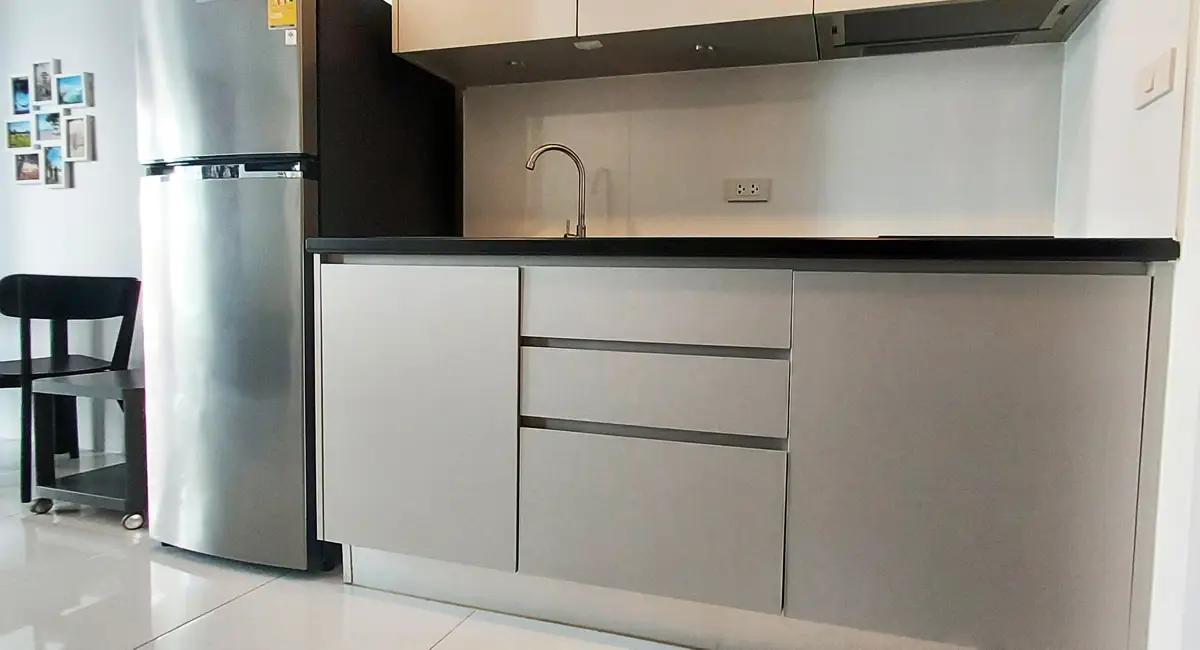 This condo on floor 4 has a living area of 32.32 square meters with a bedroom, a fully tiled bathroom, a living room and a kitchen area. The bedroom has two sliding walls/doors. Both the bedroom and the living room have air conditioning.