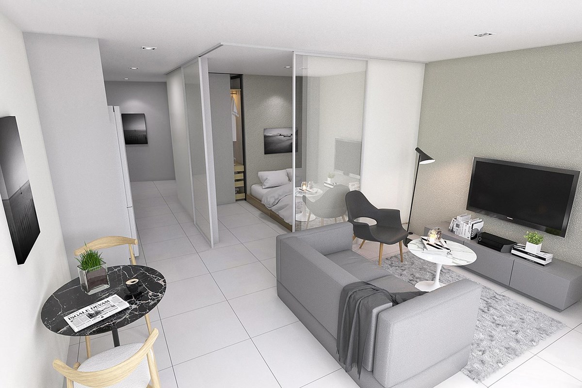 This condo has a living area of about 32 square meters with a bedroom, a fully tiled bathroom, a living room and a kitchen-area.