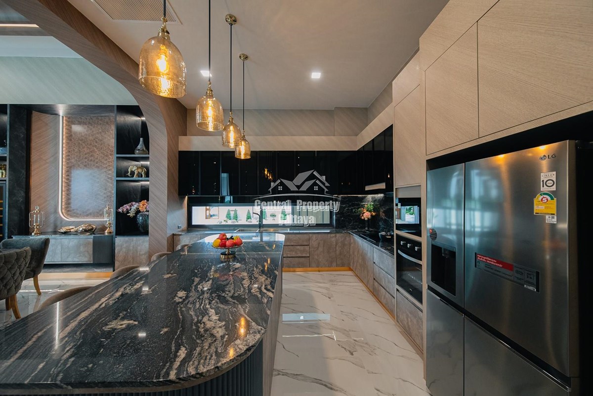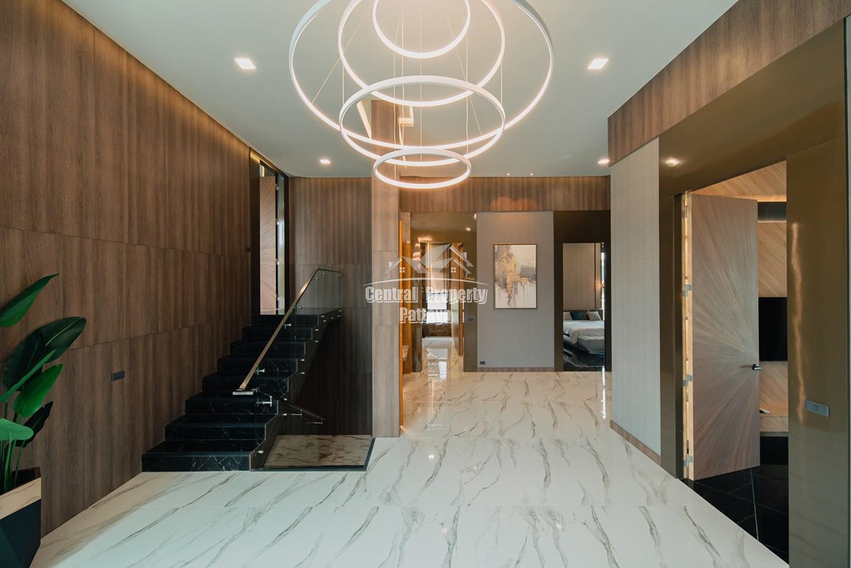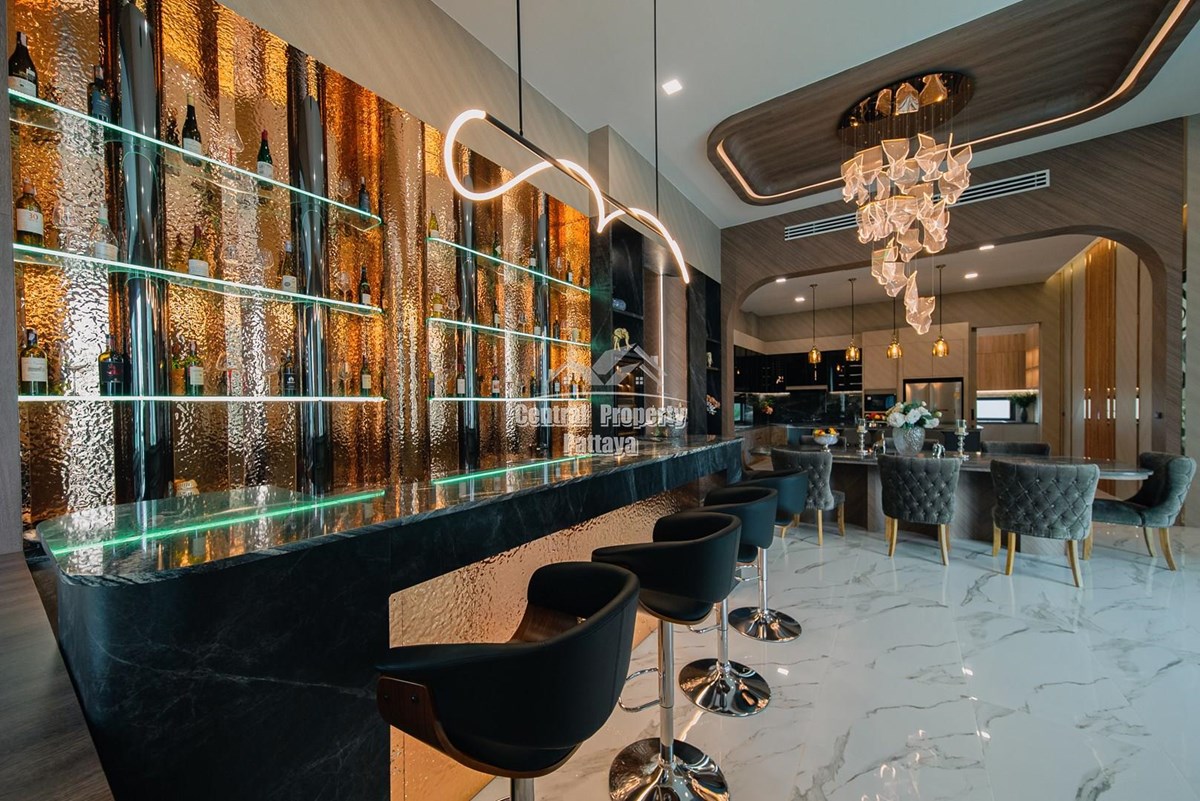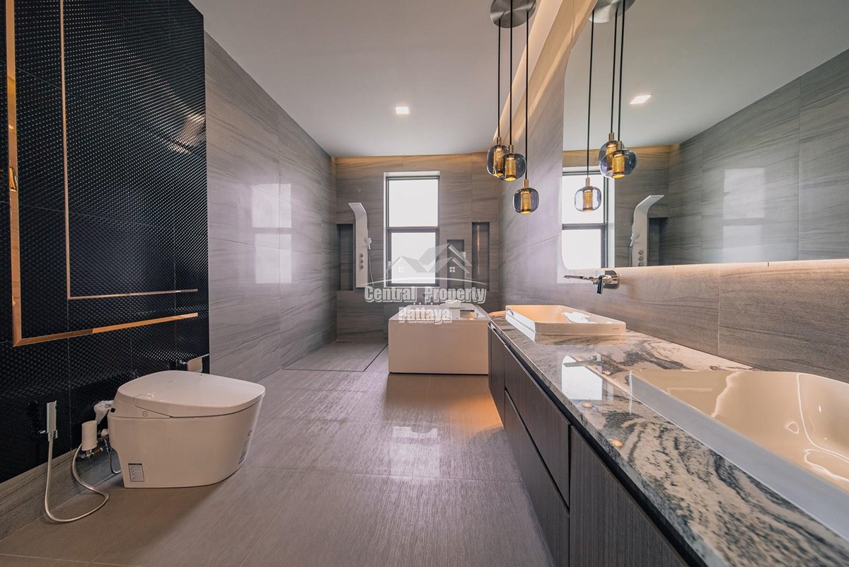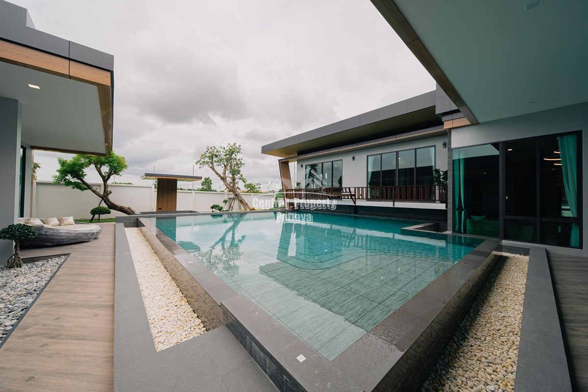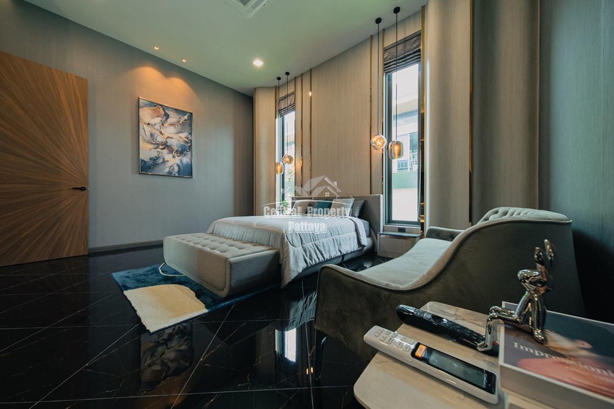 Magnificent, 6 bedroom, 7 bathroom house with private pool for sale in Thai/Company name in East Pattaya. The house has been recently completed to a very high European standard and is fully furnished, including fitted wardrobes and a professional grade European family kitchen with top quality fixtures and fittings used throughout. The bathrooms are all ensuite, spacious and very modern. The materials used throughout are of high quality with local touches used to accentuate the high ceilings, oversized rooms and spacious and stylish interior.