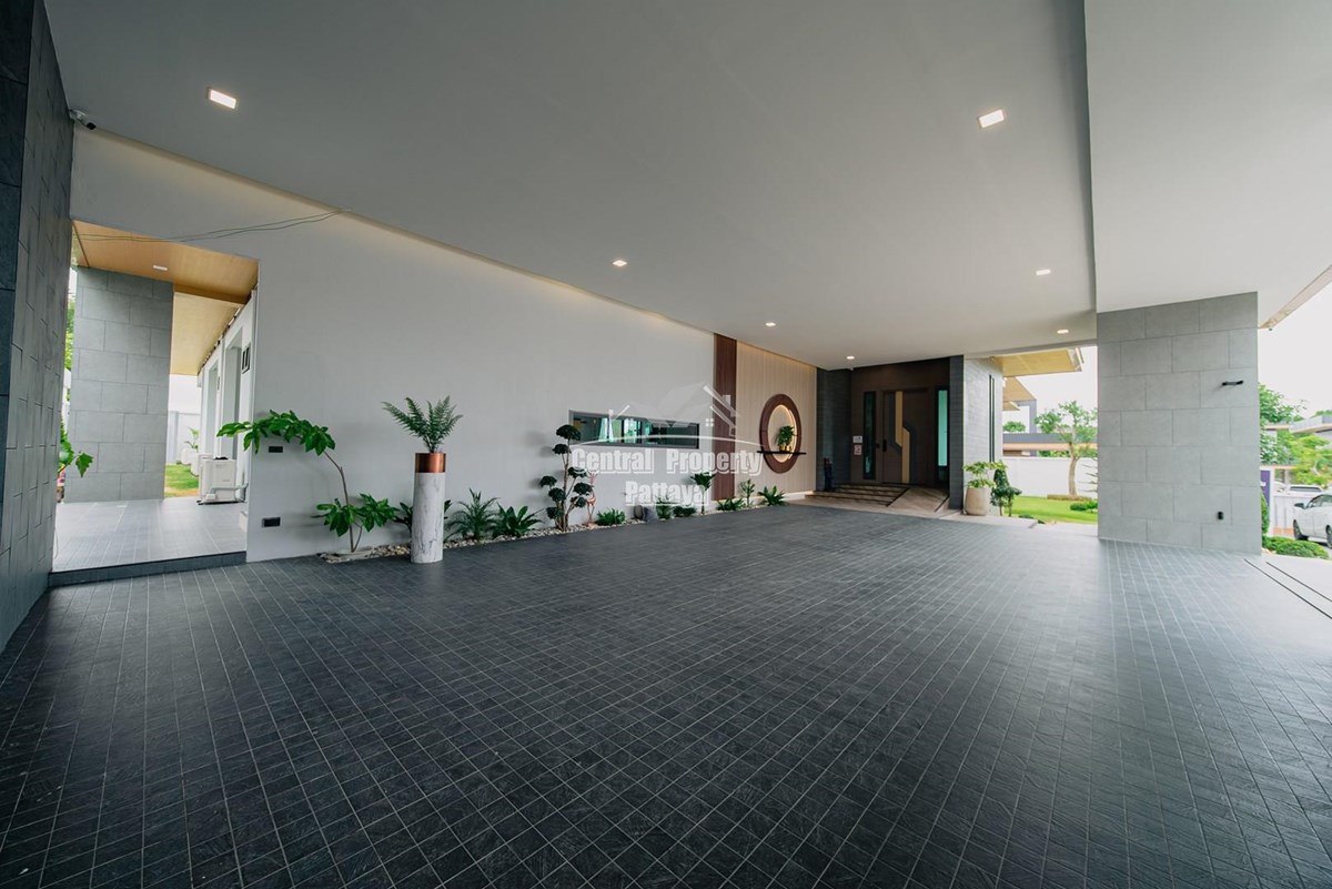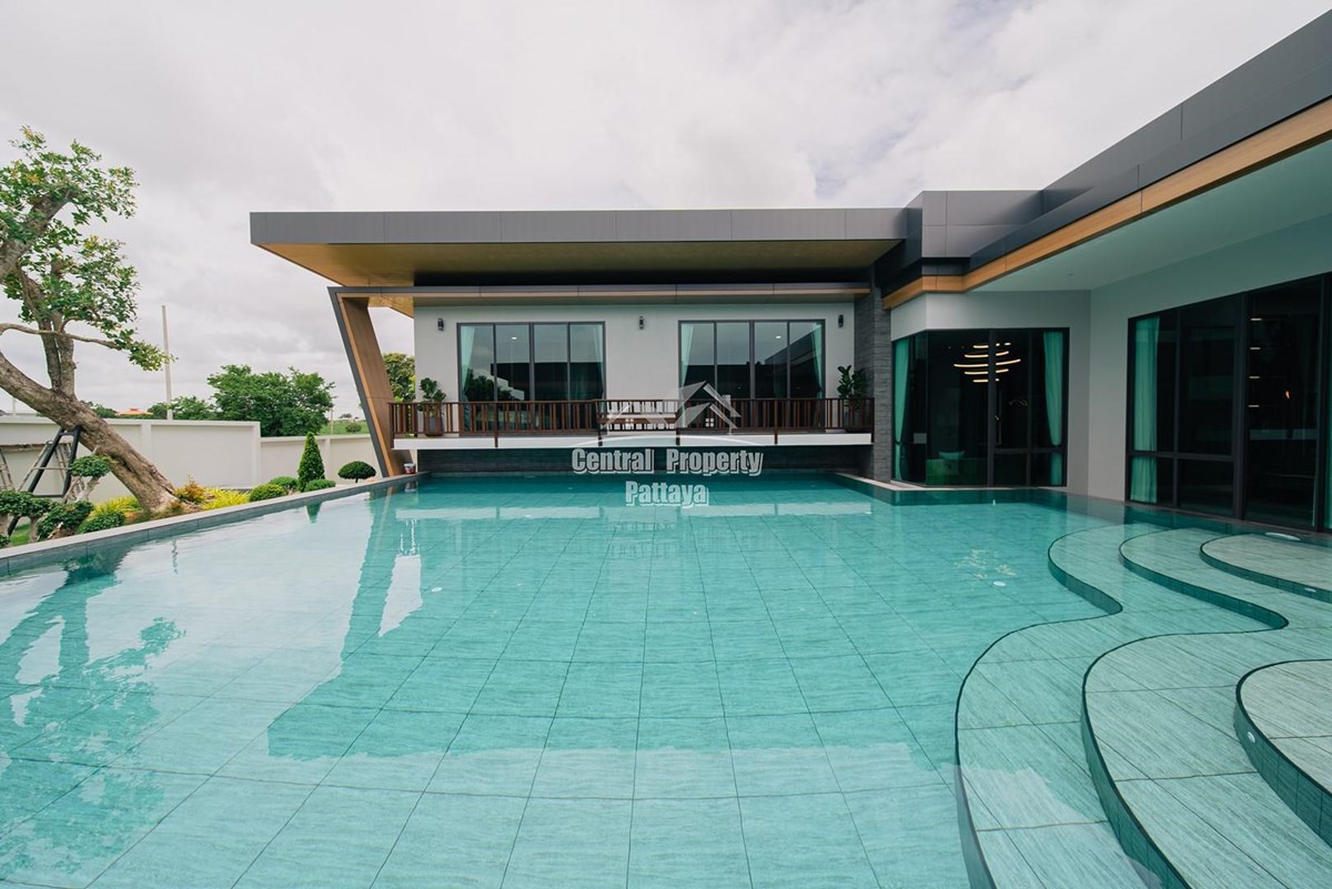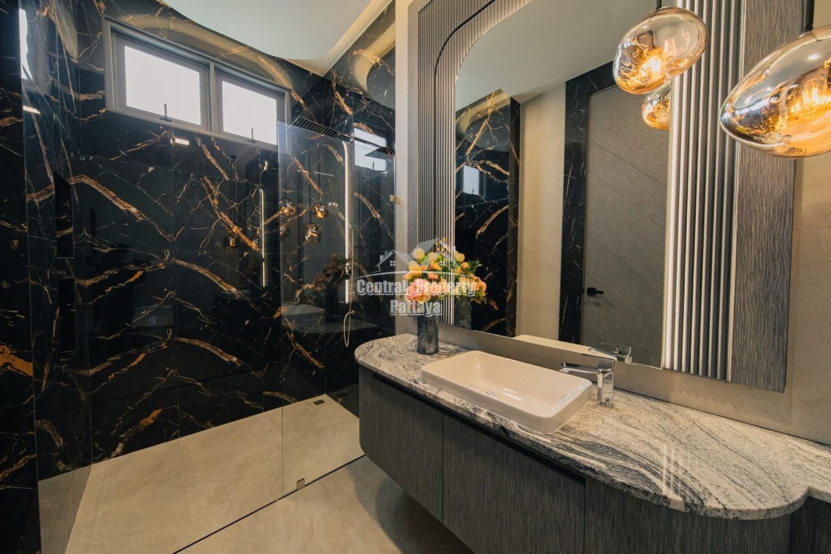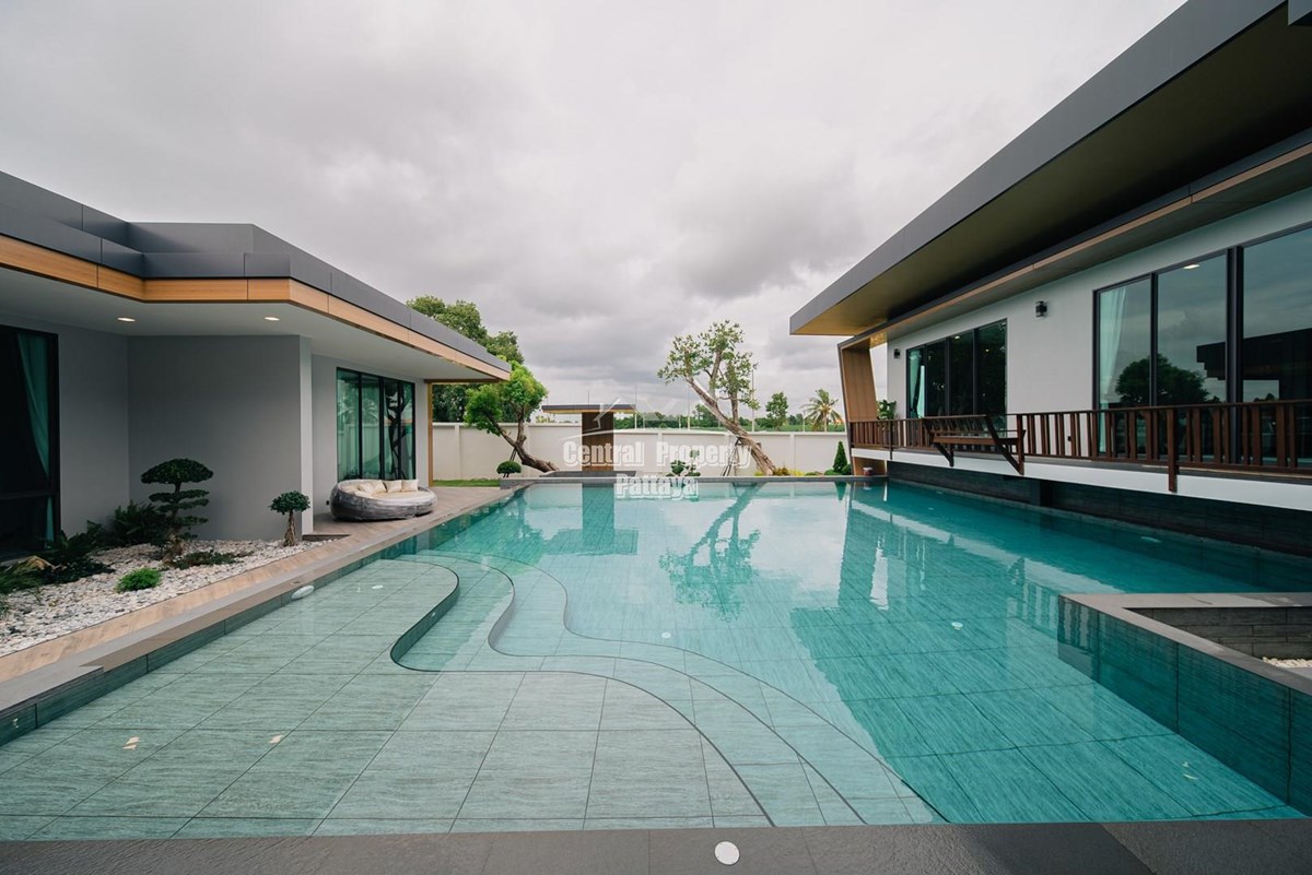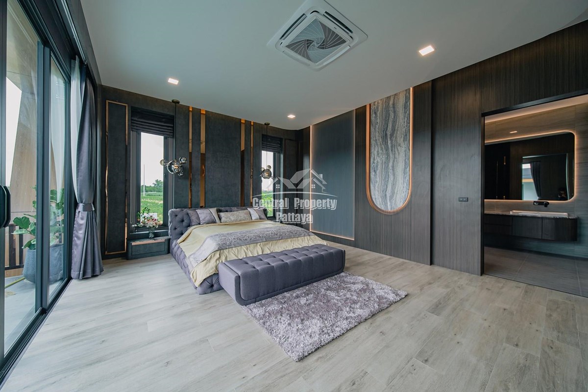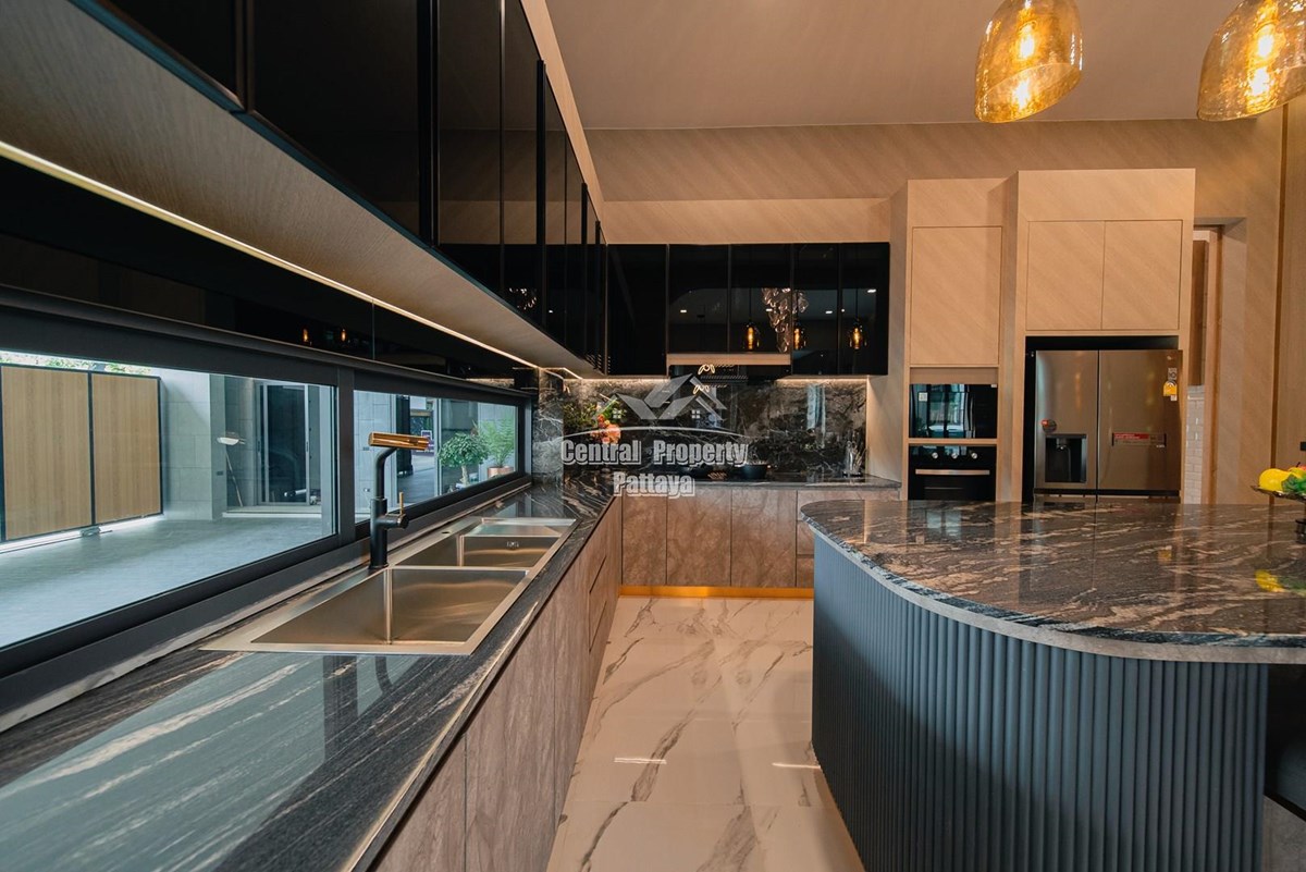 Magnificent, 6 bedroom, 7 bathroom house with private pool for sale in Thai/Company name in East Pattaya. The house has been recently completed to a very high European standard and is fully furnished, including fitted wardrobes and a professional grade European family kitchen with top quality fixtures and fittings used throughout. The bathrooms are all ensuite, spacious and very modern. The materials used throughout are of high quality with local touches used to accentuate the high ceilings, oversized rooms and spacious and stylish interior.