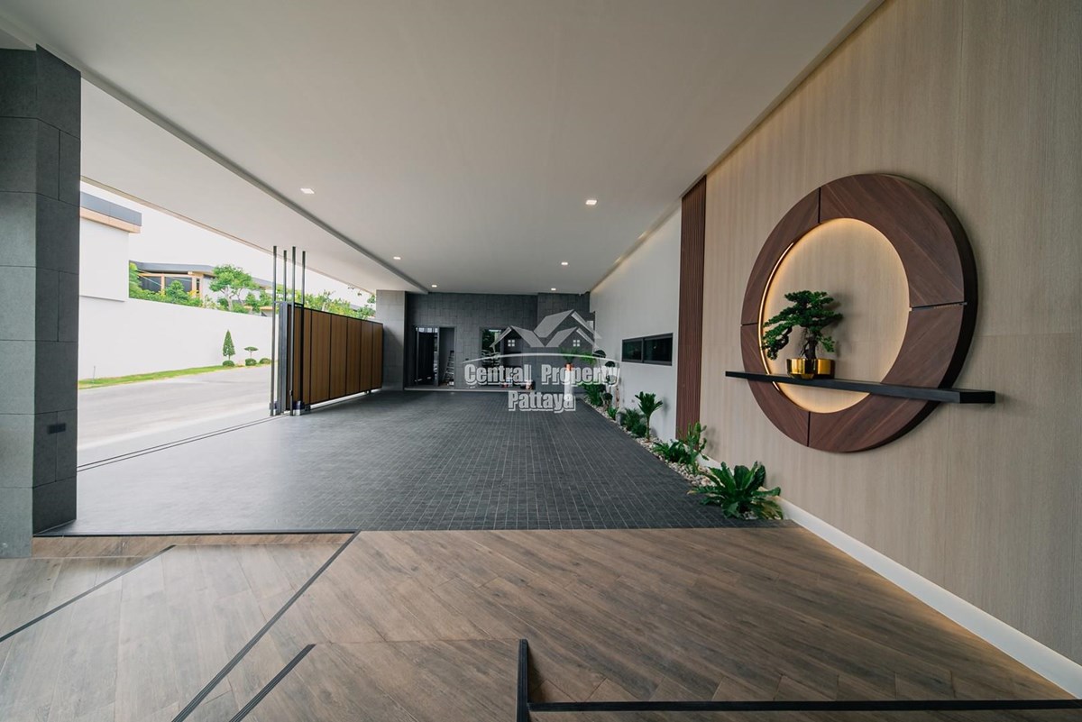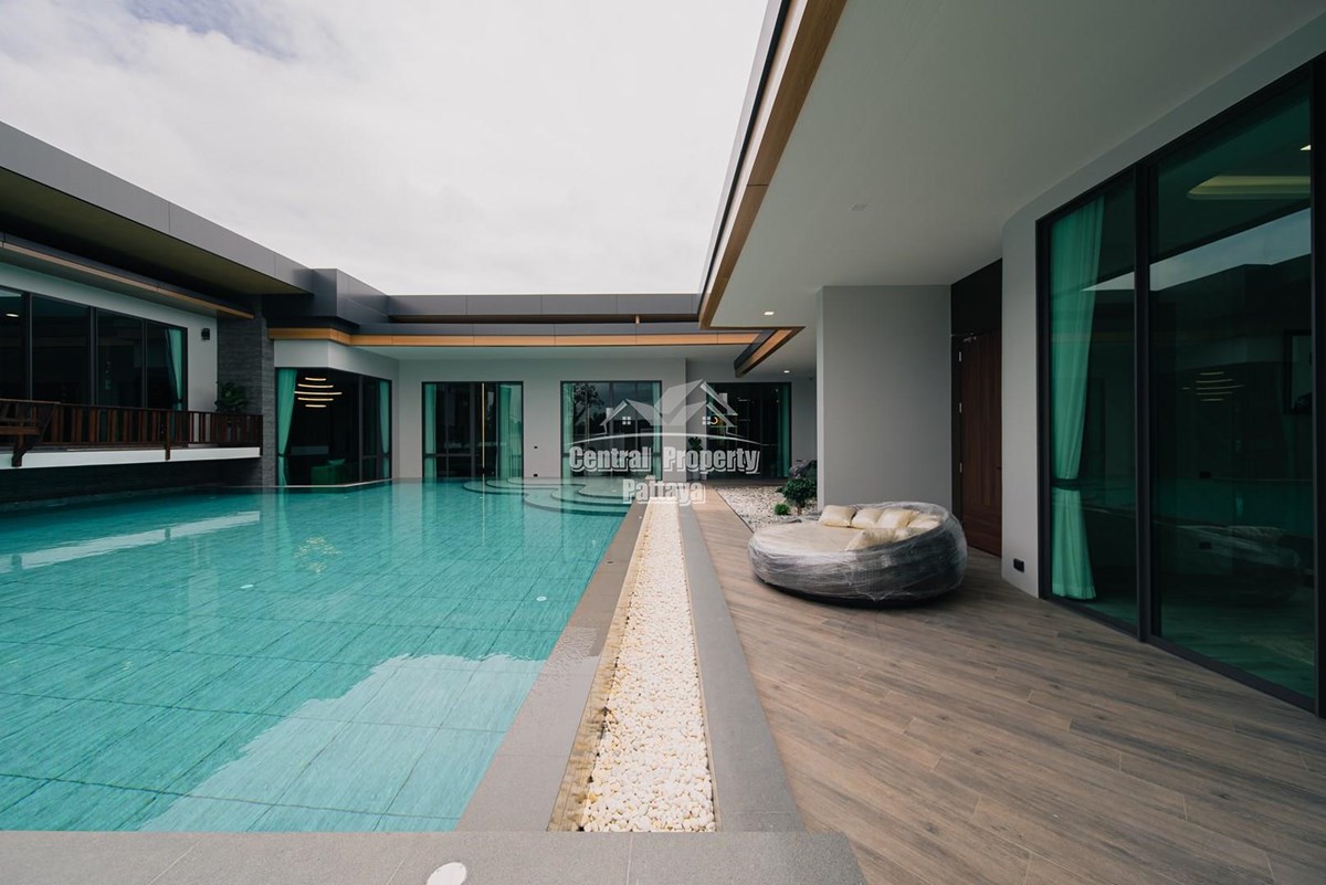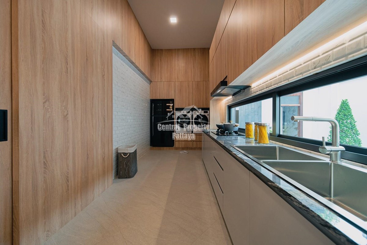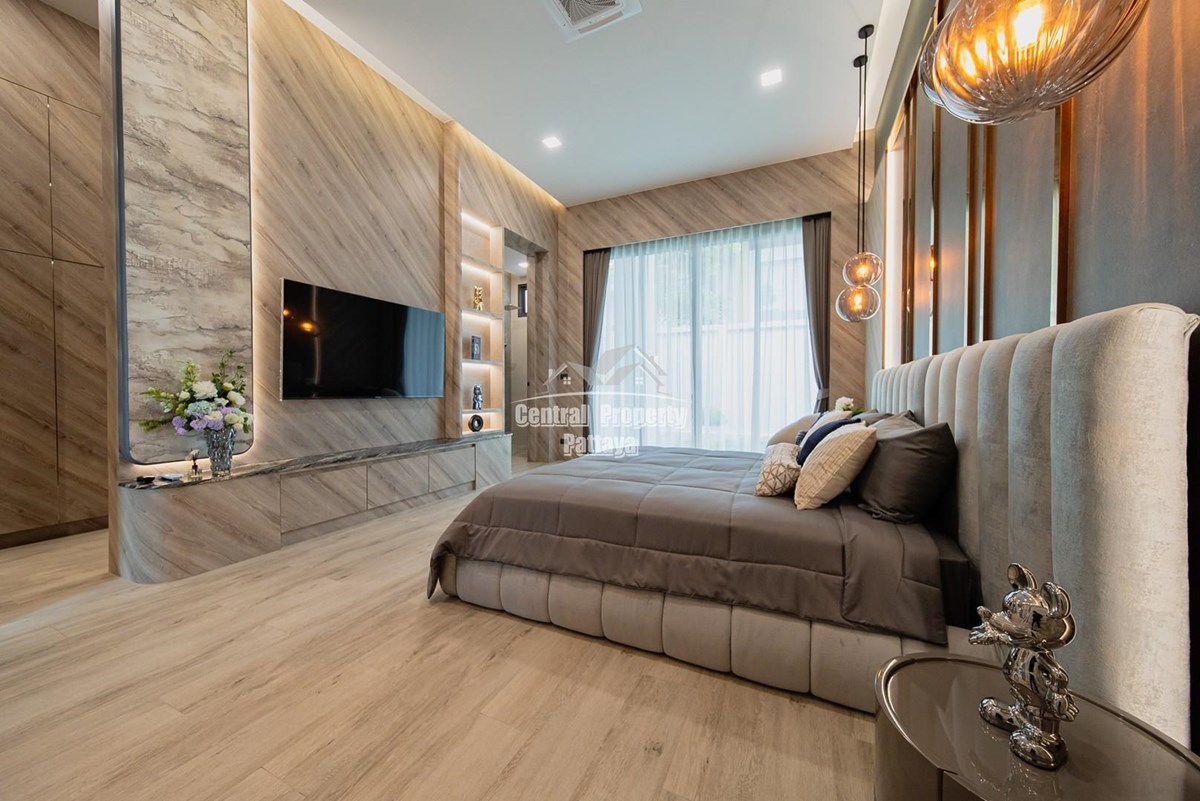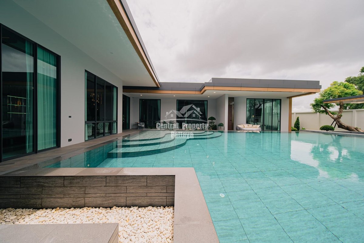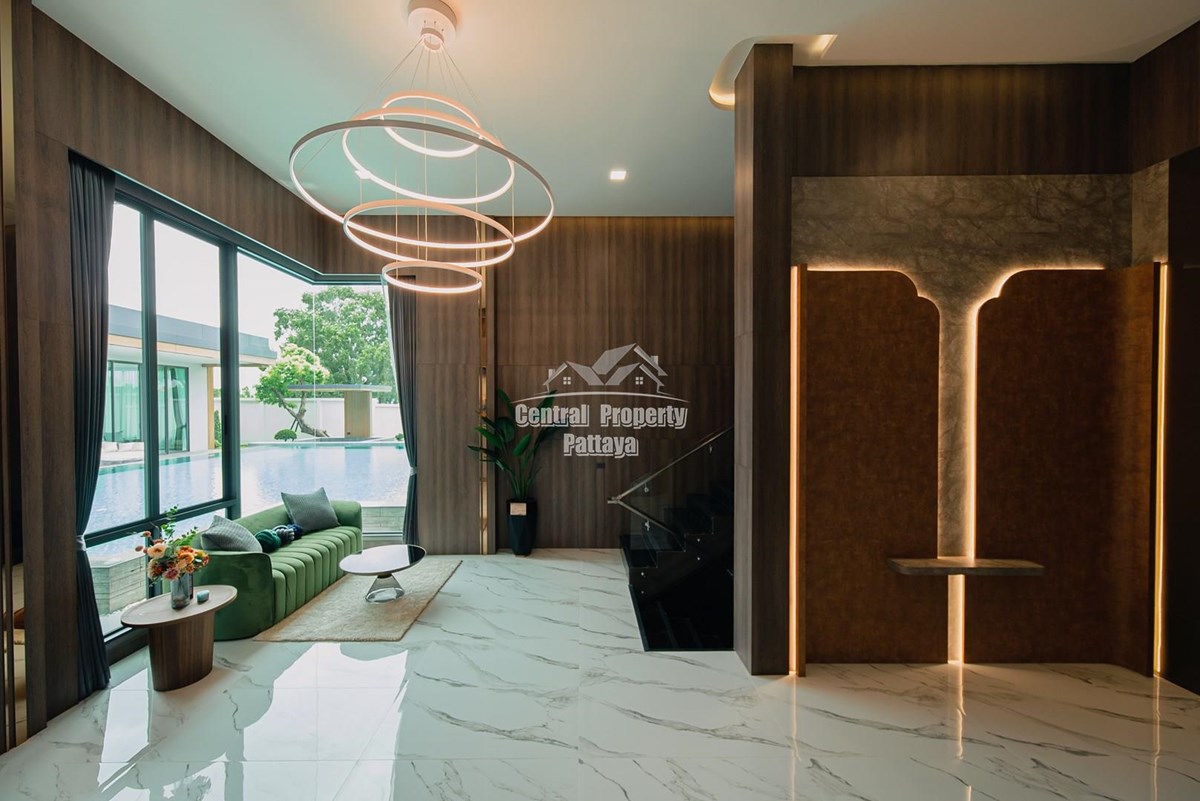 Magnificent, 6 bedroom, 7 bathroom house with private pool for sale in Thai/Company name in East Pattaya. The house has been recently completed to a very high European standard and is fully furnished, including fitted wardrobes and a professional grade European family kitchen with top quality fixtures and fittings used throughout. The bathrooms are all ensuite, spacious and very modern. The materials used throughout are of high quality with local touches used to accentuate the high ceilings, oversized rooms and spacious and stylish interior.