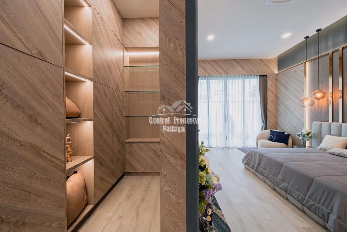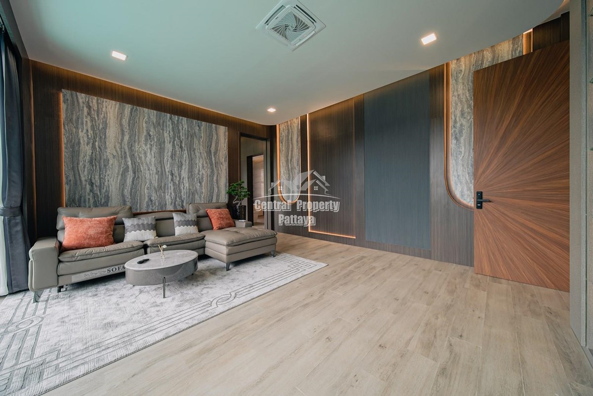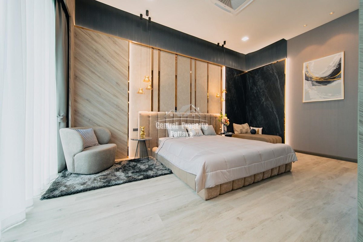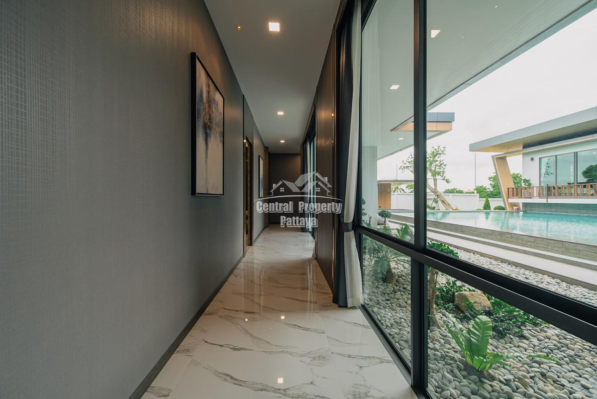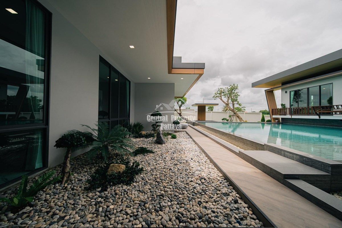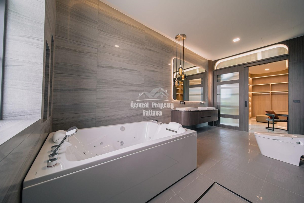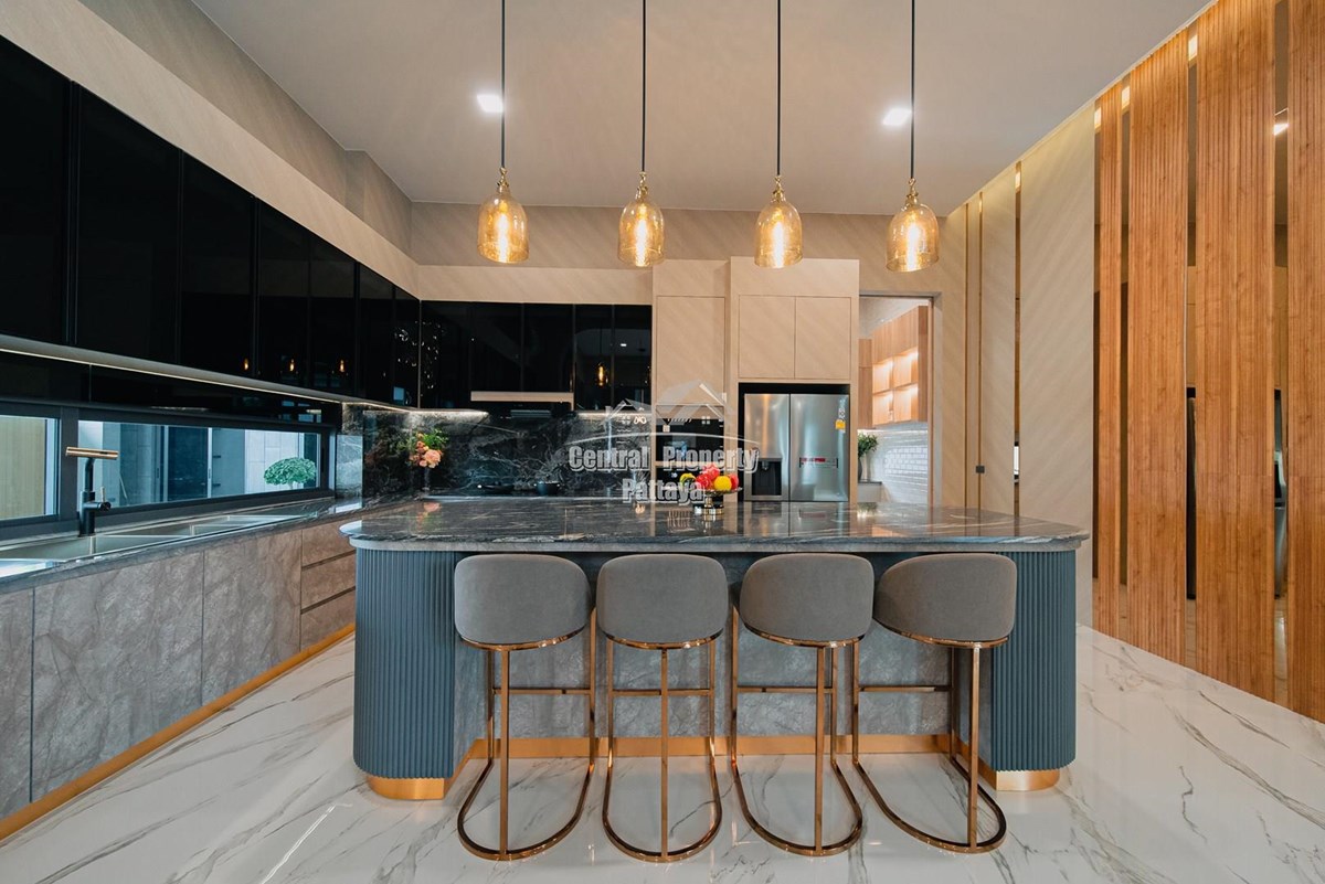 Magnificent, 6 bedroom, 7 bathroom house with private pool for sale in Thai/Company name in East Pattaya. The house has been recently completed to a very high European standard and is fully furnished, including fitted wardrobes and a professional grade European family kitchen with top quality fixtures and fittings used throughout. The bathrooms are all ensuite, spacious and very modern. The materials used throughout are of high quality with local touches used to accentuate the high ceilings, oversized rooms and spacious and stylish interior.