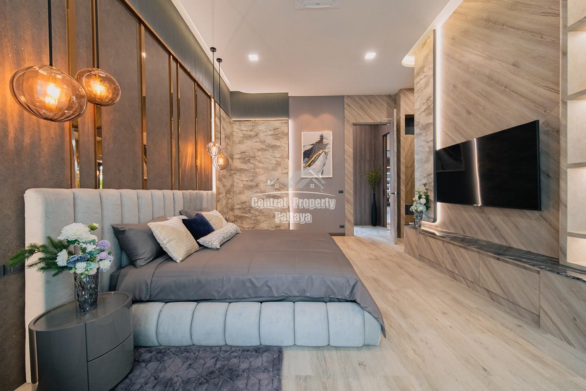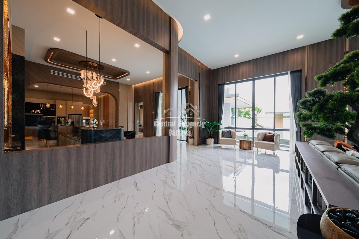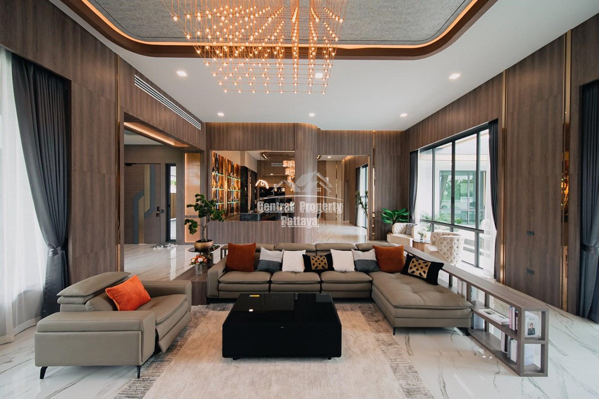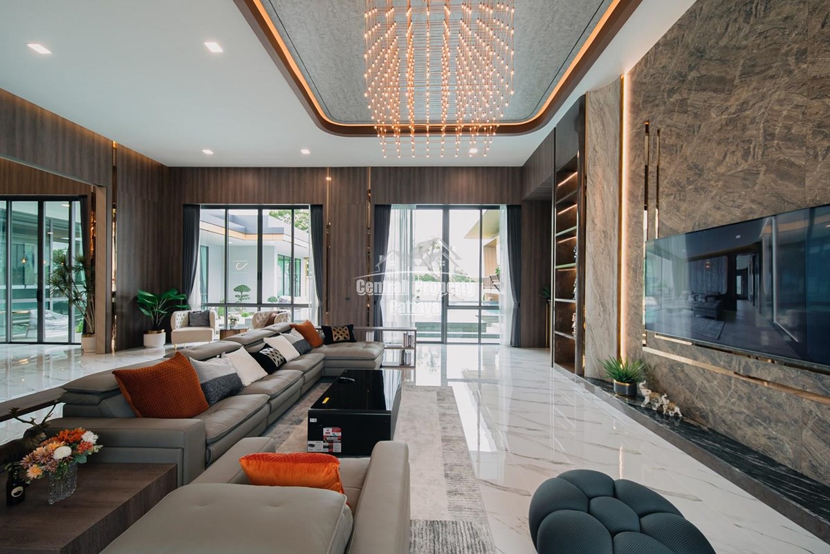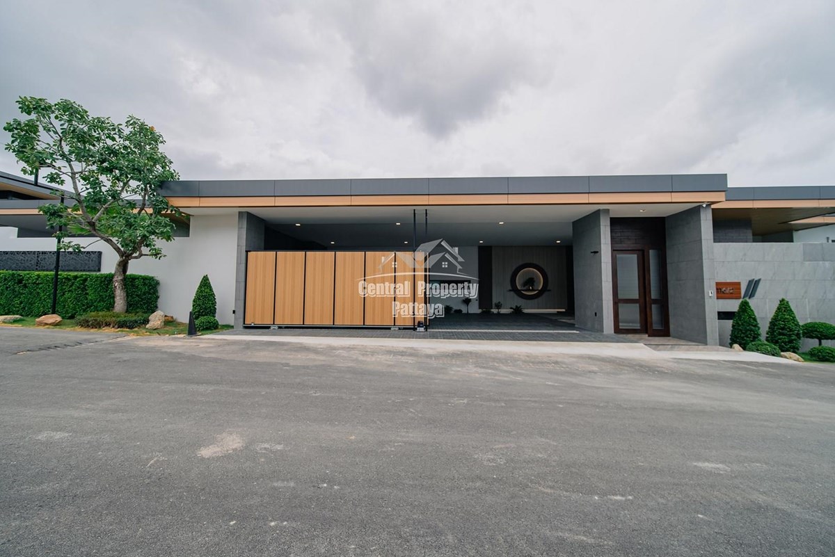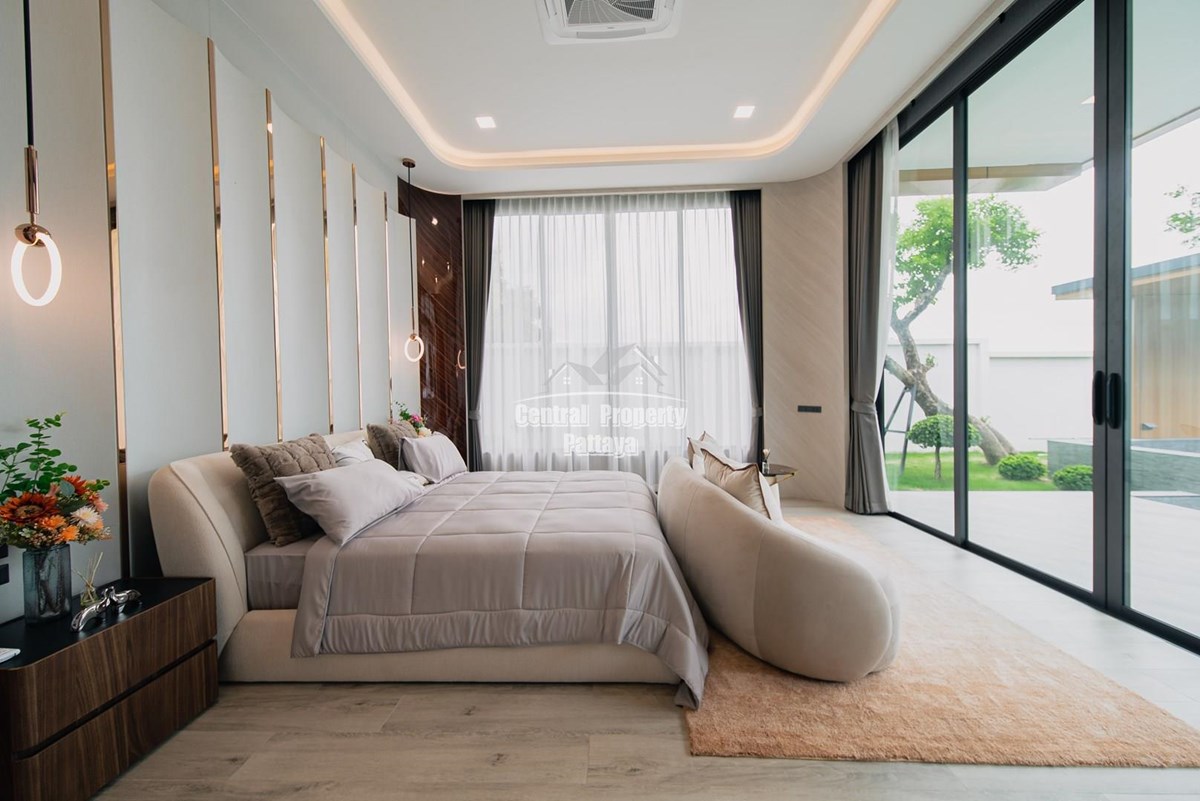 Magnificent, 6 bedroom, 7 bathroom house with private pool for sale in Thai/Company name in East Pattaya. The house has been recently completed to a very high European standard and is fully furnished, including fitted wardrobes and a professional grade European family kitchen with top quality fixtures and fittings used throughout. The bathrooms are all ensuite, spacious and very modern. The materials used throughout are of high quality with local touches used to accentuate the high ceilings, oversized rooms and spacious and stylish interior.