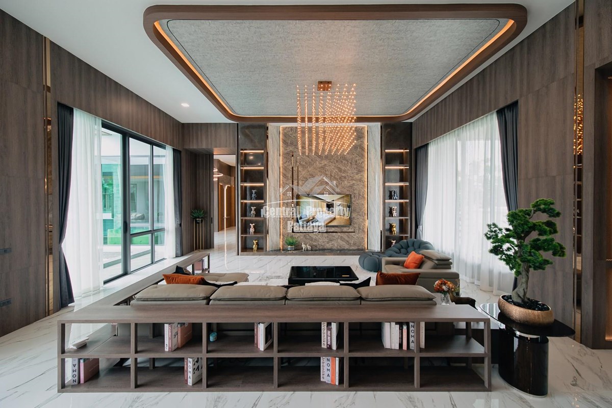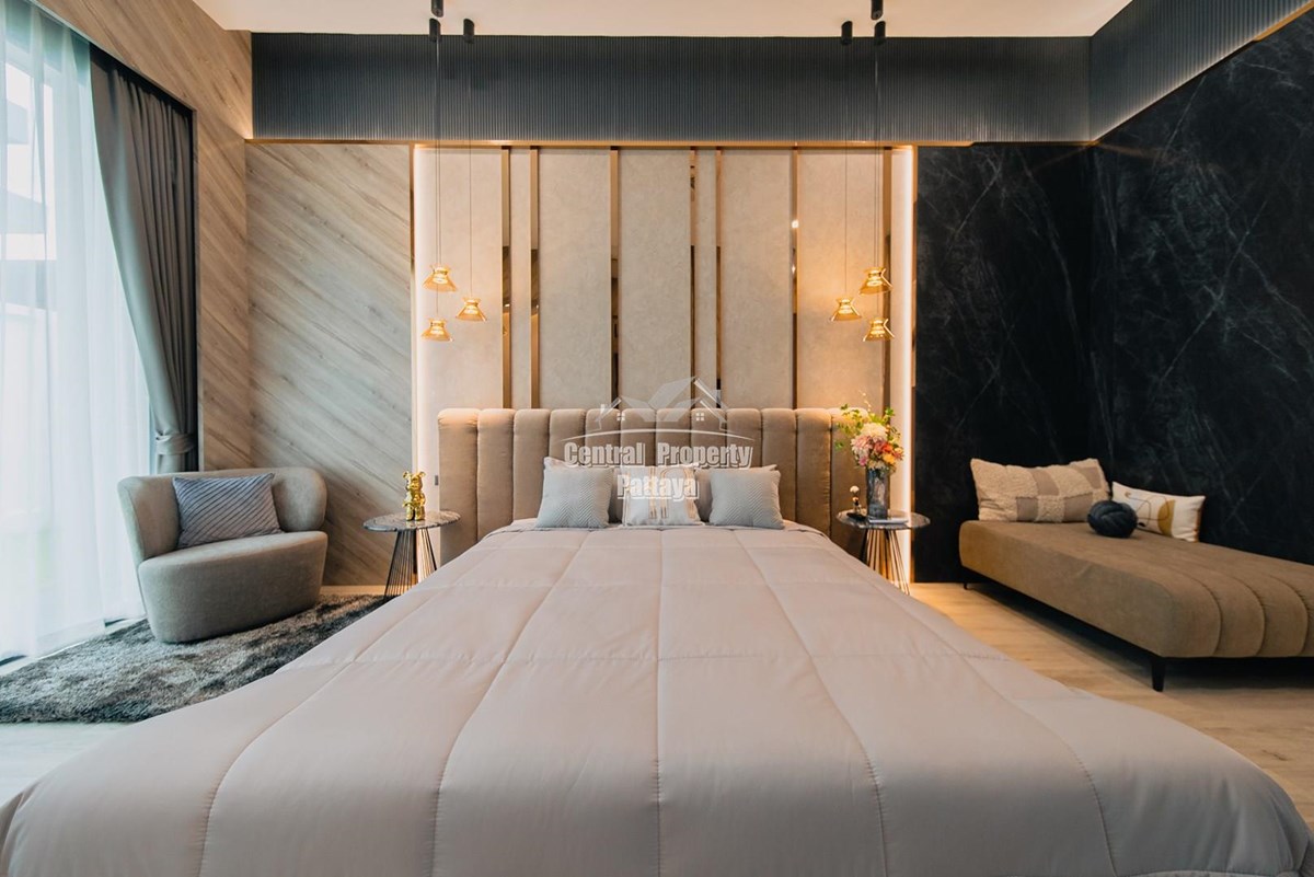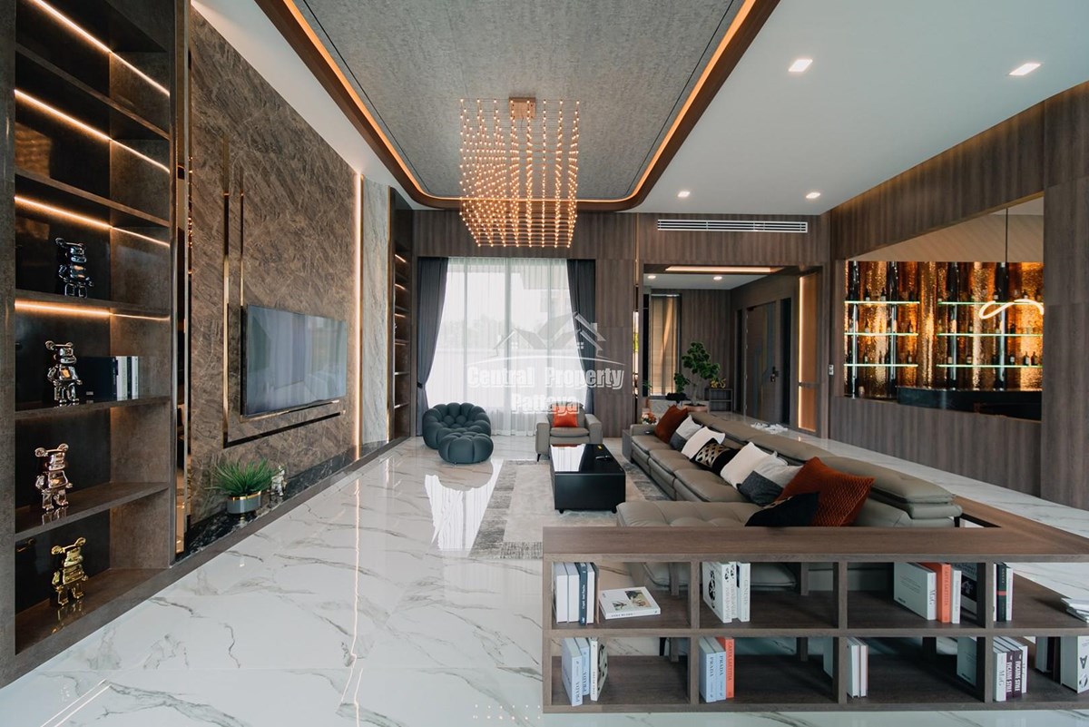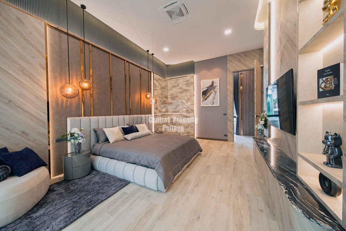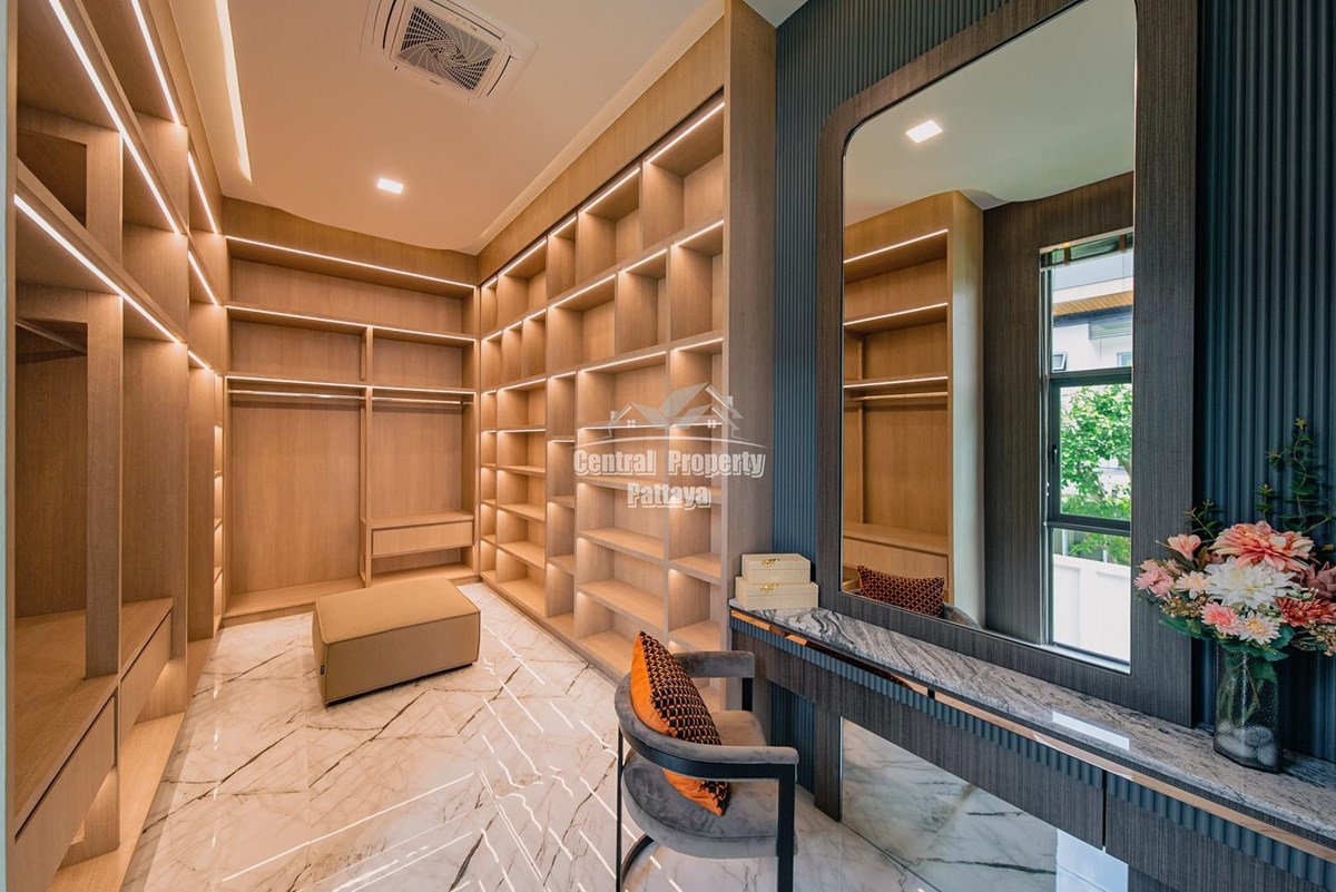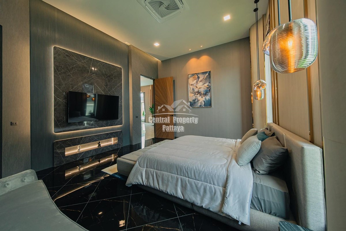 Magnificent, 6 bedroom, 7 bathroom house with private pool for sale in Thai/Company name in East Pattaya. The house has been recently completed to a very high European standard and is fully furnished, including fitted wardrobes and a professional grade European family kitchen with top quality fixtures and fittings used throughout. The bathrooms are all ensuite, spacious and very modern. The materials used throughout are of high quality with local touches used to accentuate the high ceilings, oversized rooms and spacious and stylish interior.