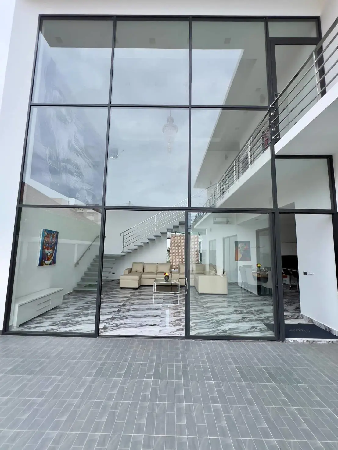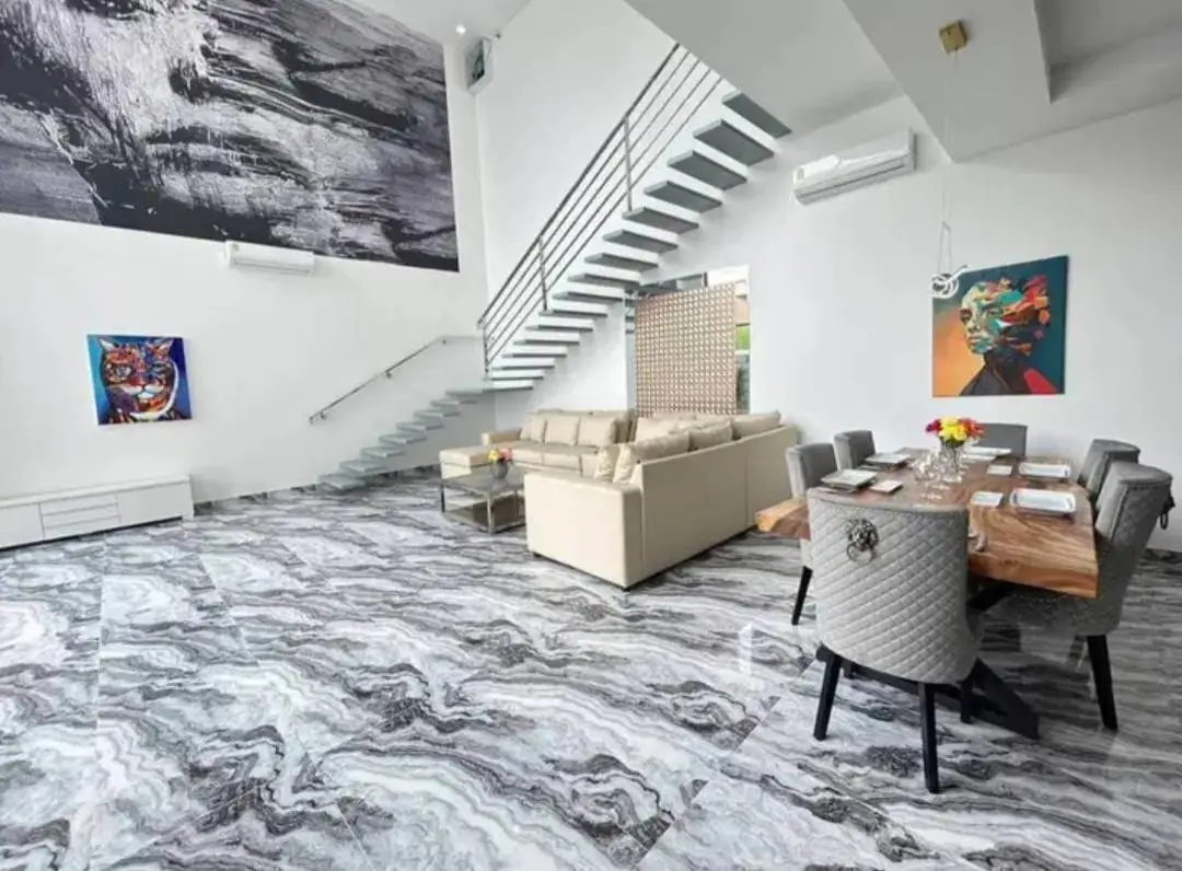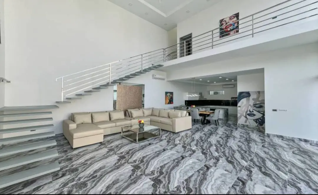 Living Space: 585 sqm of thoughtfully designed interiors with impressive 8-meter-high ceilings in the living room.
