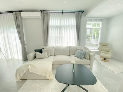 This is a 4 bedroom, 5 bathroom detached house available to rent at Mantana Bangna-Wongwaen. The house has an interior area of 250 sqm. over 2 floors and sits on 77 Sq. Wah of land. The property has ample parking (3 cars), a garden, a maid's room and it comes fully furnished. The village has a communal swimming pool, gym and security service.