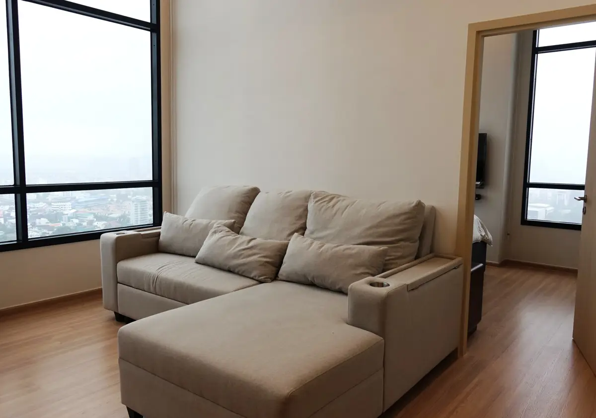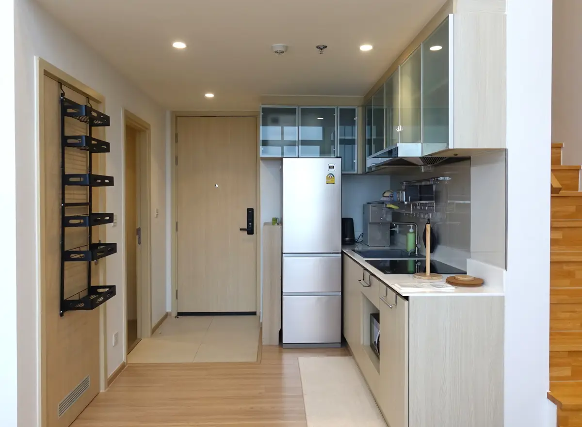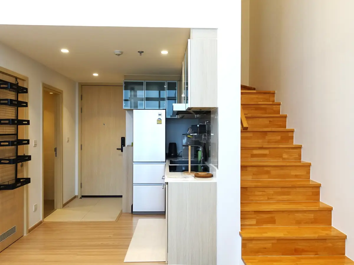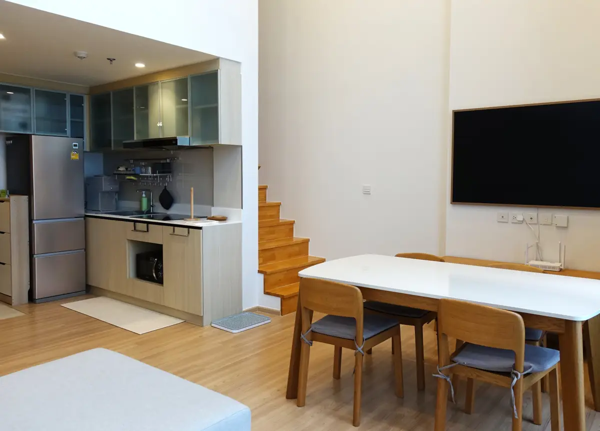 Maru Ekkamai 2 is a stylish, pet-friendly high-rise condominium located on Sukhumvit 63 (Ekkamai) in Bangkok’s trendy Watthana District, just 450 meters from BTS Ekkamai station . Developed by Major Development (MJD Residences), this 32-story tower comprises 333 residential units, completed in December 2020. This is a duplex type 2 bedroom, 2 bathroom condo on the market for sale. The freehold condo is on the 29th floor, comes furnished and measures a spacious 76 sqm.