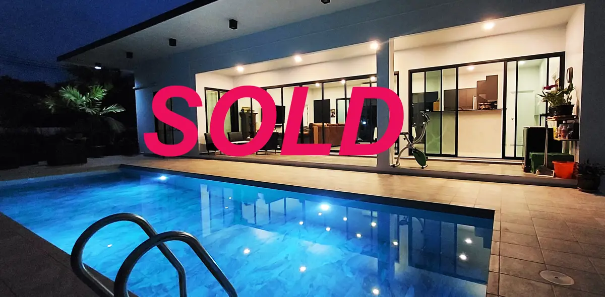 Extensively upgraded and improved 3 bedroom villa. This only 4 years old pool villa in the new residential area Villa Mantra in Mae Phim has 3 bedrooms, 2 bathrooms and a large shared living room and kitchen in a U-shape, with large glass doors out to the garden and pool on both sides. With open doors, it turns the living room into a large terrace.