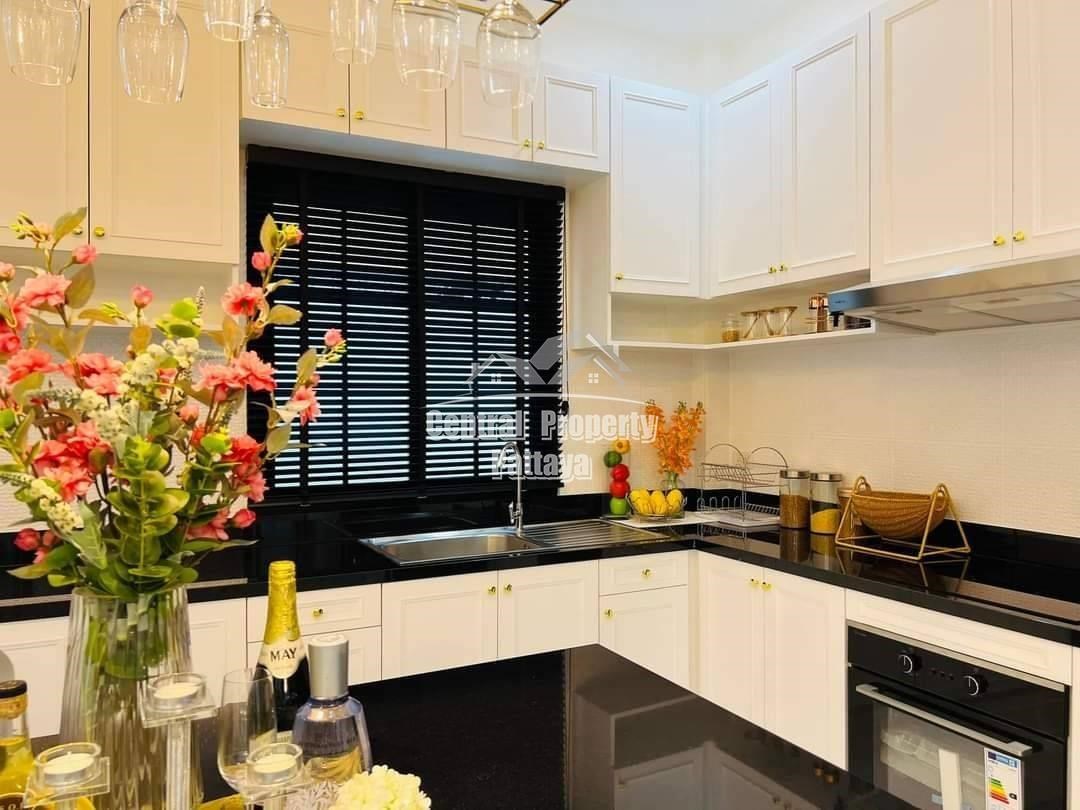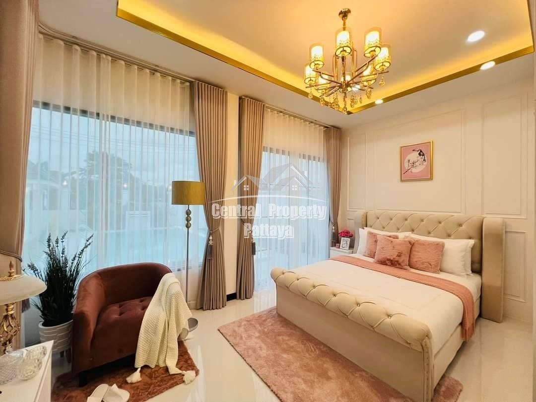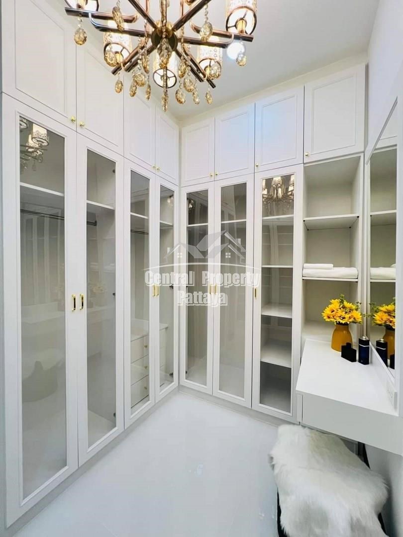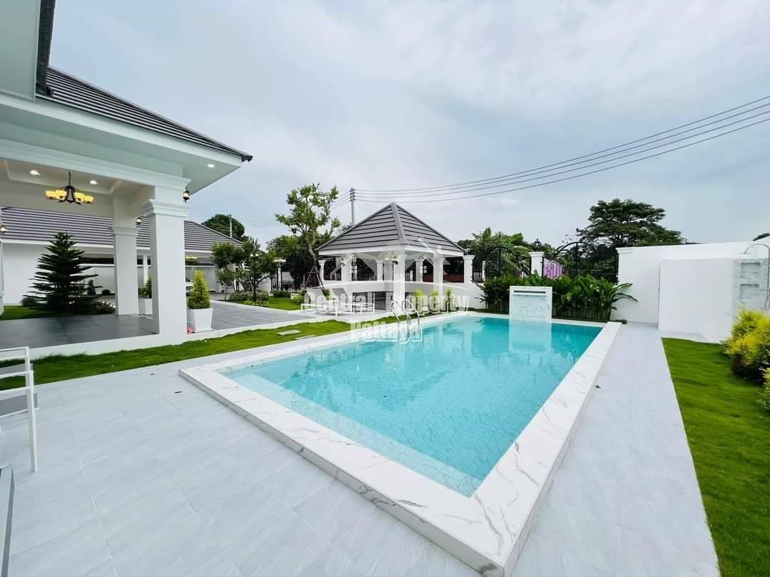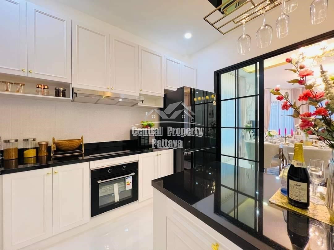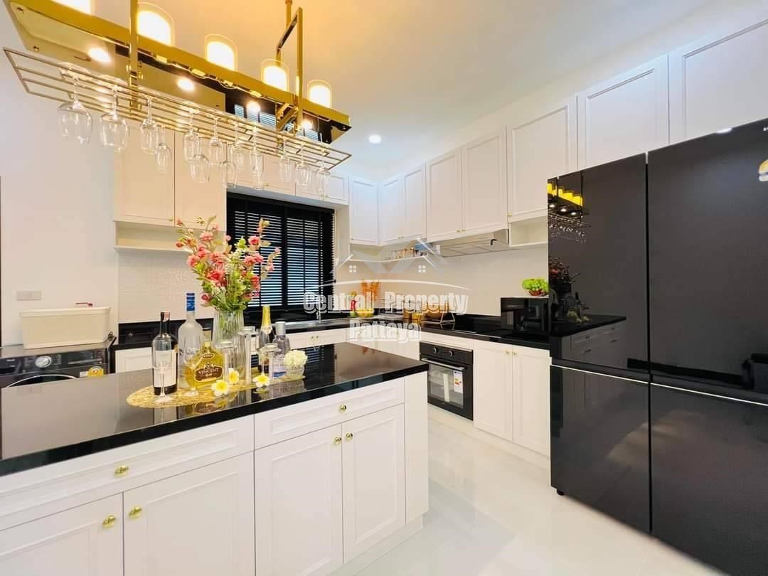 Exceptional 4 bedroom, 4 bathroom house with private pool for sale in Thai/Company name in East Pattaya. The house has been recently completed to a very high standard and is fully furnished, including fitted wardrobes and a professional grade European family kitchen. The bathrooms are all ensuite and very modern with bathtubs and rain showers. The bedrooms are all oversized and tastefully decorated with fitted wardrobes, ample storage and a beautiful walk-in robe for the master bedroom suite. The materials used throughout are of high quality with local touches used to accentuate the high ceilings and spacious, stylish interior.