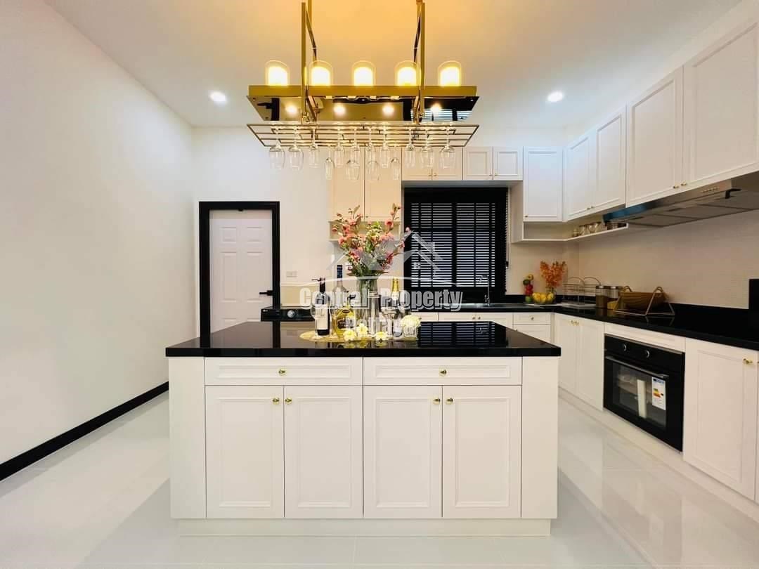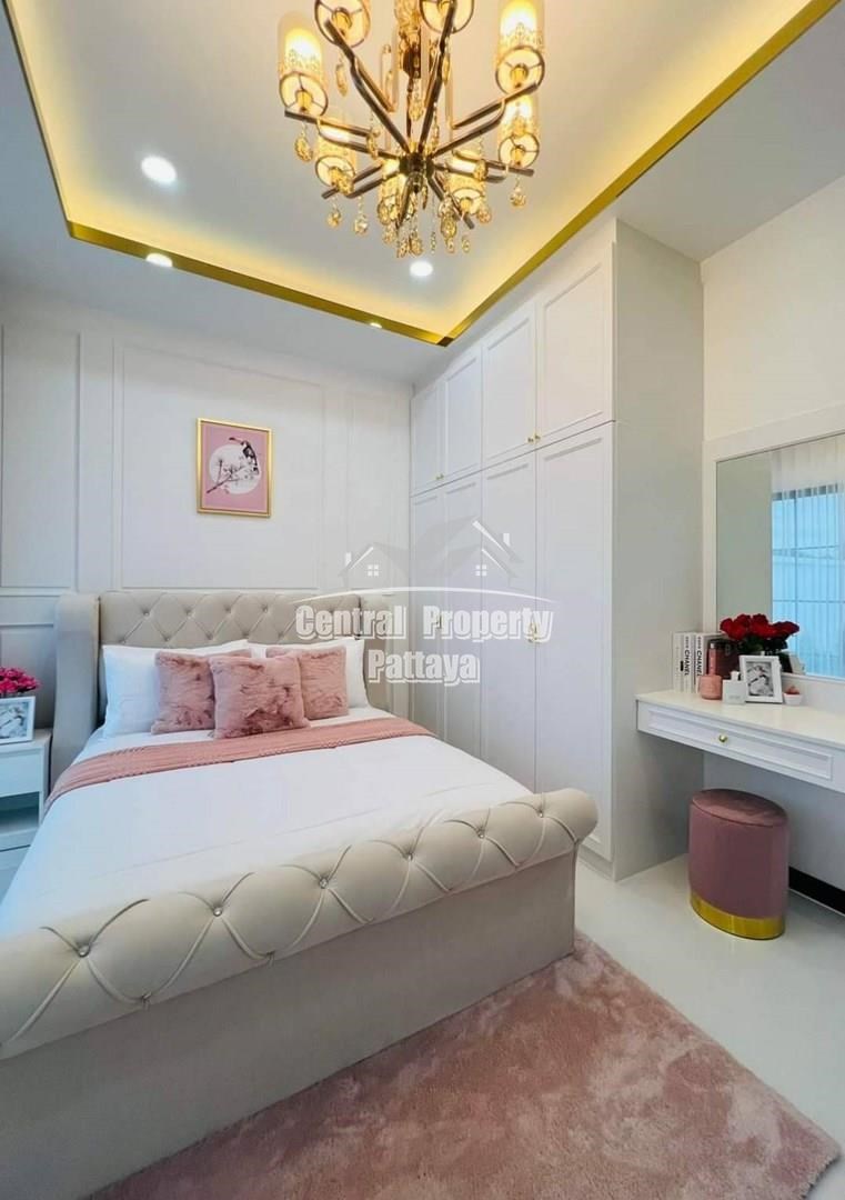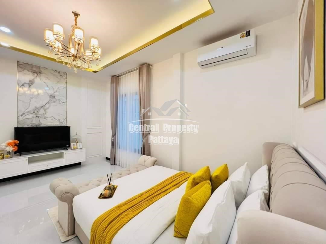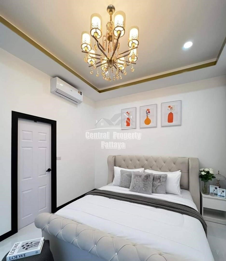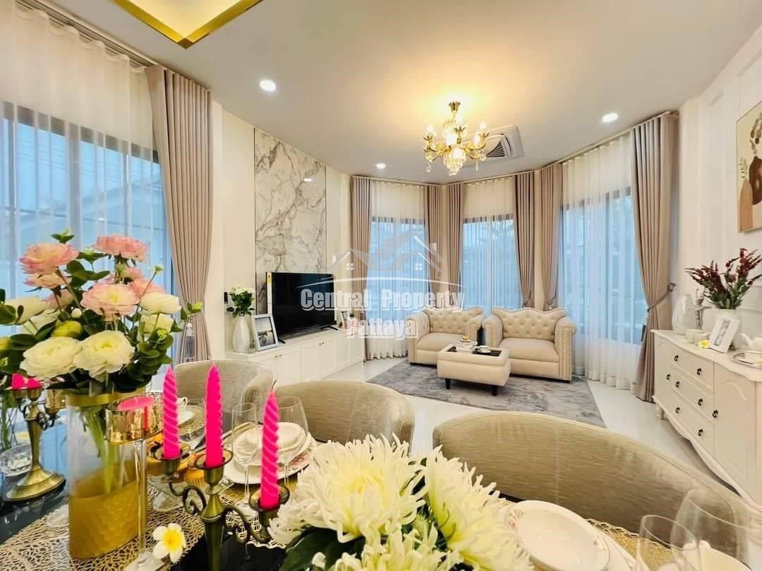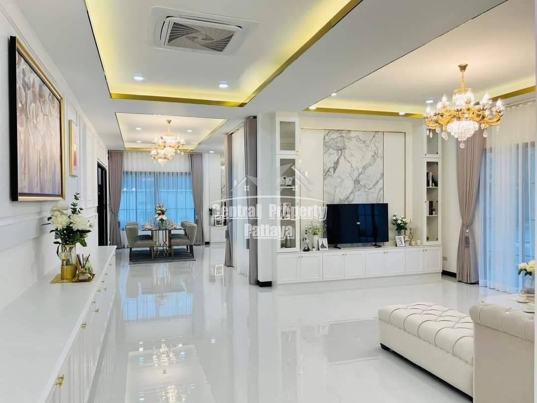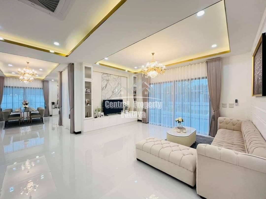 Exceptional 4 bedroom, 4 bathroom house with private pool for sale in Thai/Company name in East Pattaya. The house has been recently completed to a very high standard and is fully furnished, including fitted wardrobes and a professional grade European family kitchen. The bathrooms are all ensuite and very modern with bathtubs and rain showers. The bedrooms are all oversized and tastefully decorated with fitted wardrobes, ample storage and a beautiful walk-in robe for the master bedroom suite. The materials used throughout are of high quality with local touches used to accentuate the high ceilings and spacious, stylish interior.