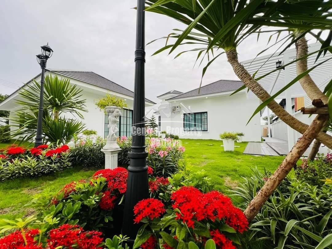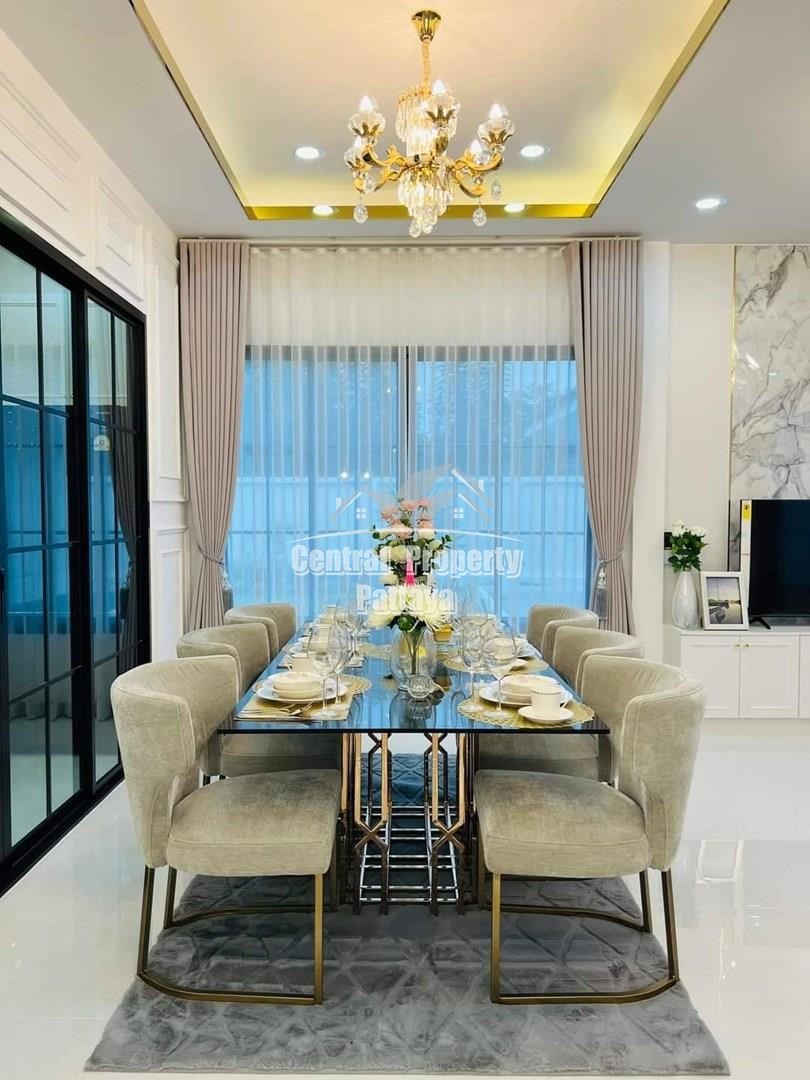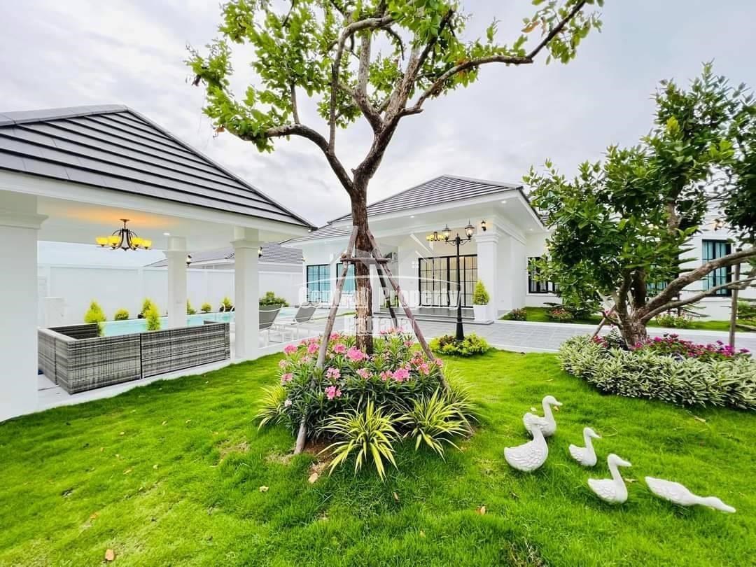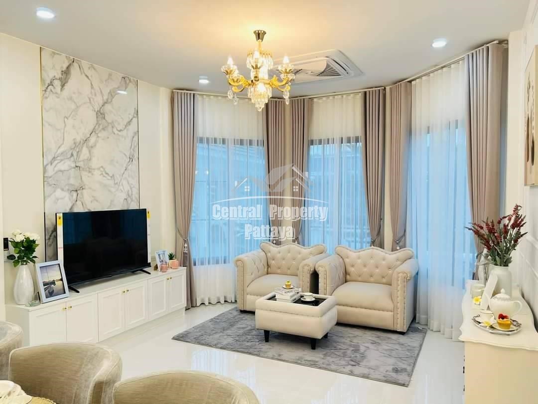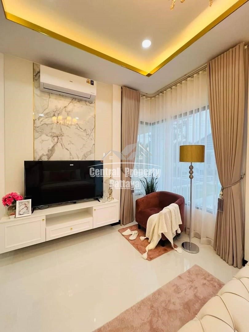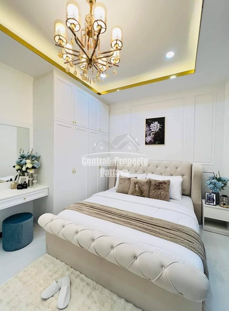 Exceptional 4 bedroom, 4 bathroom house with private pool for sale in Thai/Company name in East Pattaya. The house has been recently completed to a very high standard and is fully furnished, including fitted wardrobes and a professional grade European family kitchen. The bathrooms are all ensuite and very modern with bathtubs and rain showers. The bedrooms are all oversized and tastefully decorated with fitted wardrobes, ample storage and a beautiful walk-in robe for the master bedroom suite. The materials used throughout are of high quality with local touches used to accentuate the high ceilings and spacious, stylish interior.