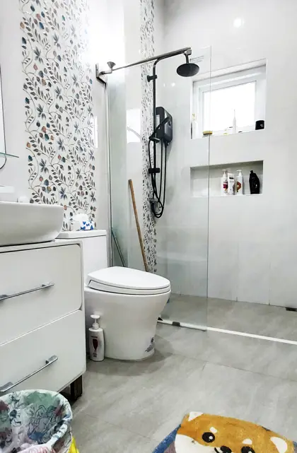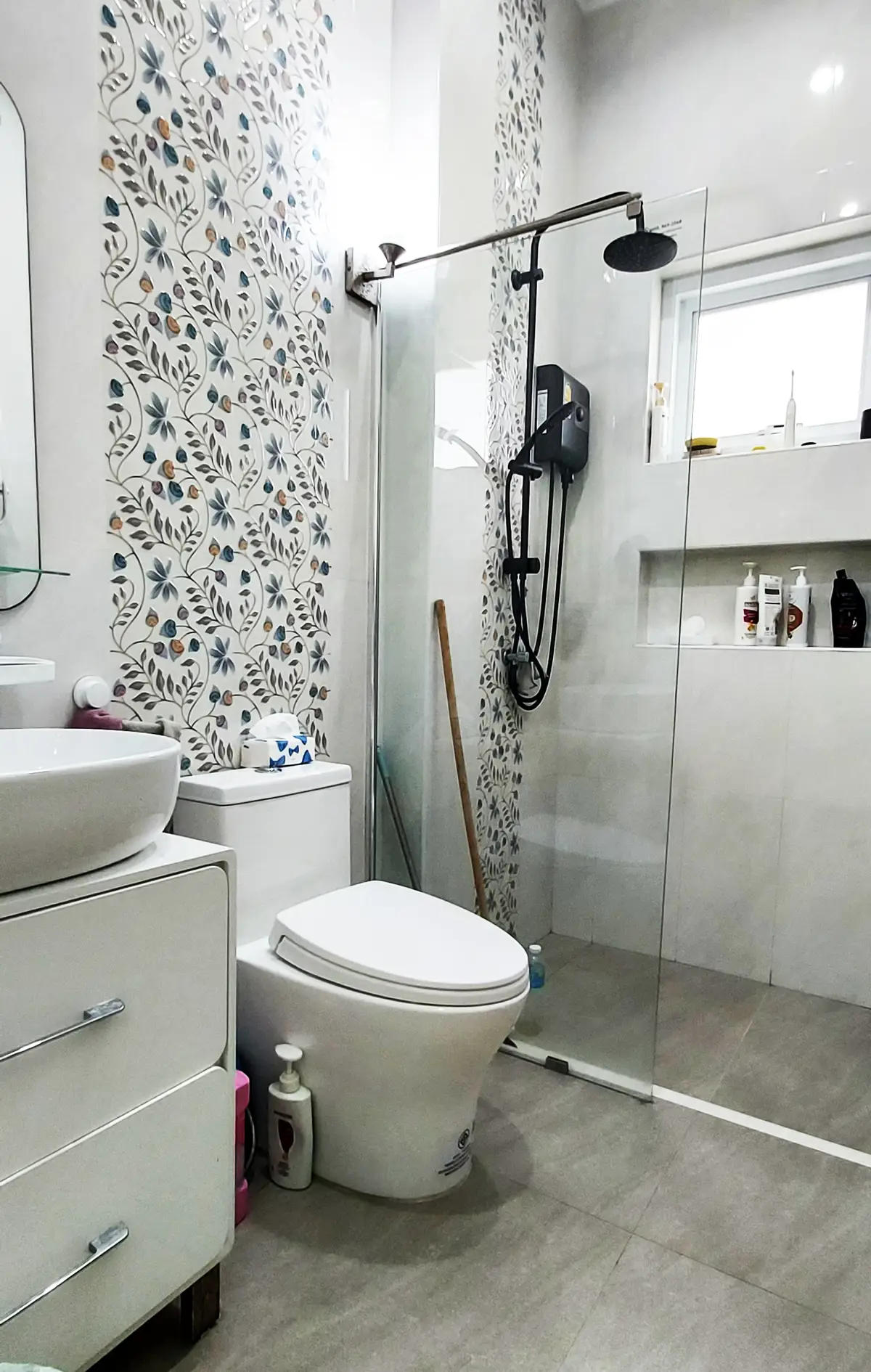 The kitchen with a corner bench has a gas stove with fan and sink, fridge and freezer and dishwasher, as well as various equipment. The bathroom is fully tiled. Every room has air conditioning. There are also two wall fans. Indoor ceiling height 3.30 meter makes the house airy.