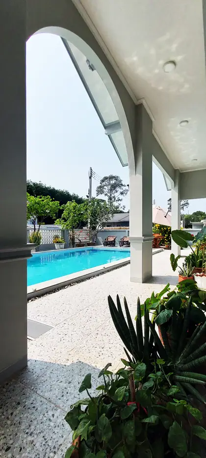 The land area is 132.4 sq.w. which is 529.6 sq.m. On the land there is a large saltwater pool measuring 9.5 x 4.5 x 1.4 m. (length * width * depth) There is also furniture, a table and sunbathing seats. There is a garden with flowers and fruits, both in pots and planted on the ground.