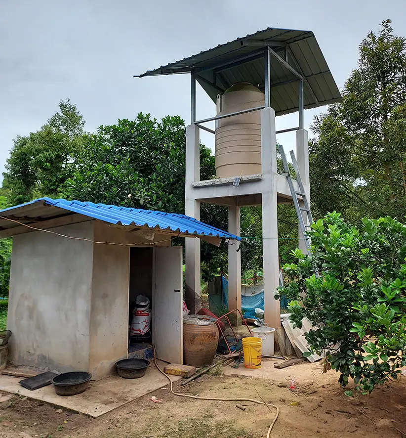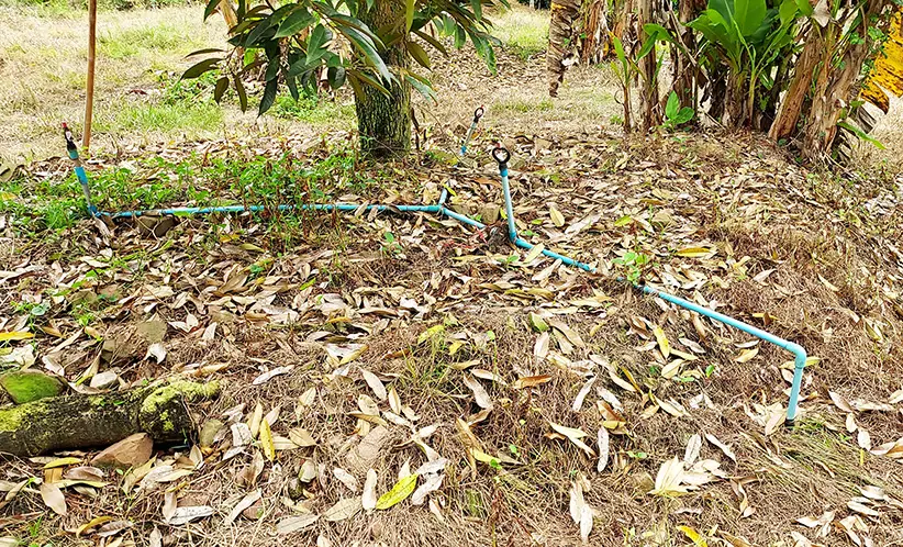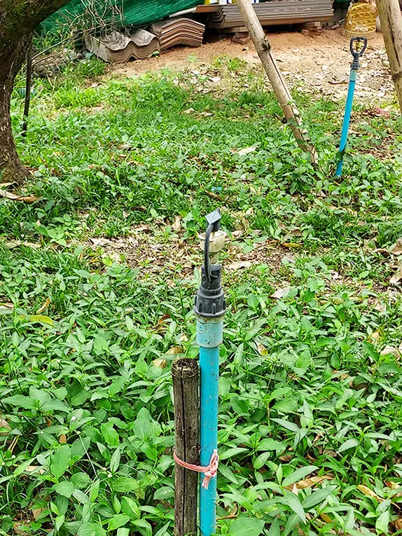 The garden has an irrigation system with sprinklers. Water comes from groundwater with a deep drilled well, and as security also from the municipality. The water is stored in a water tower.