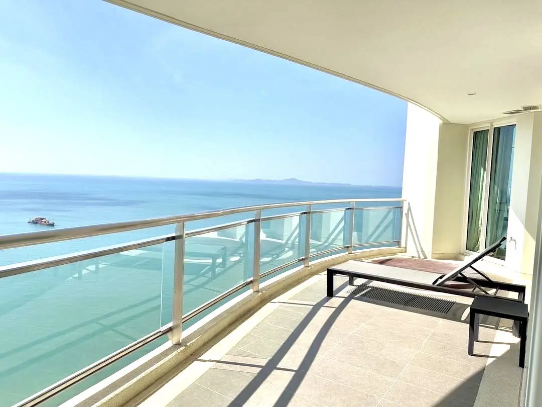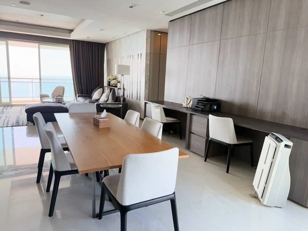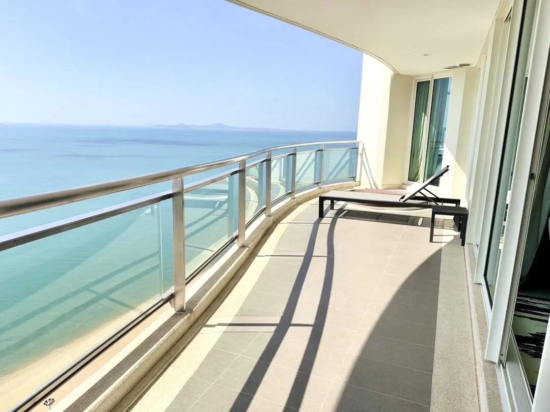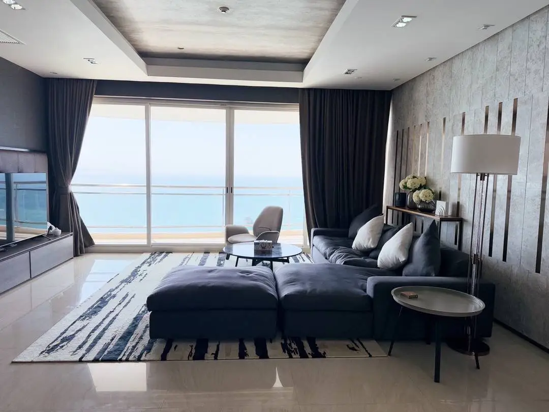 Experience luxury beachfront living in this rare 4-bedroom high-floor corner unit on the 29th floor of Tower A, offering panoramic Pattaya city and sea views.