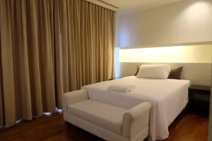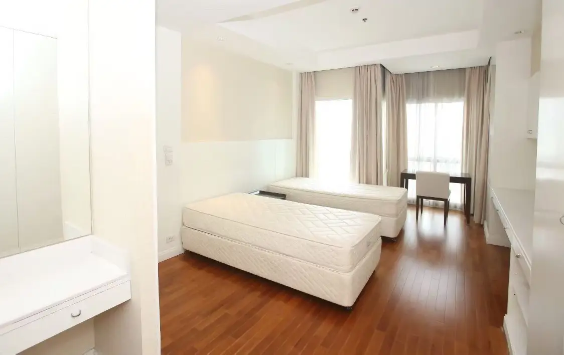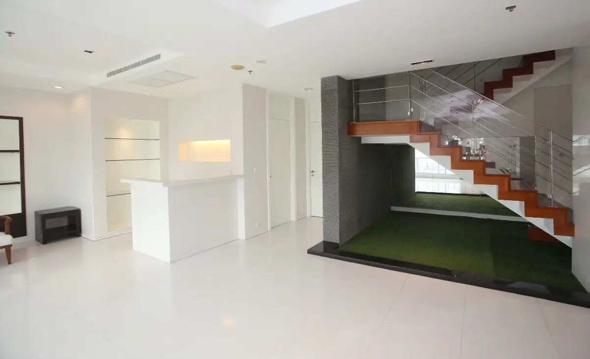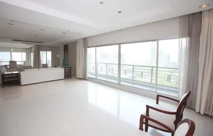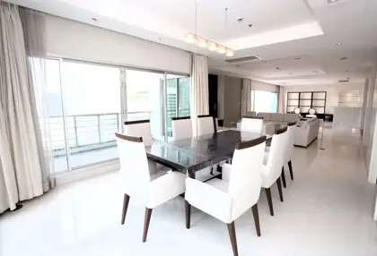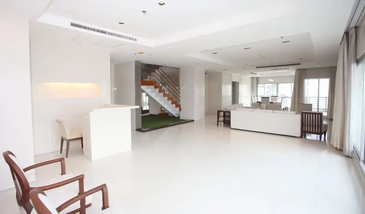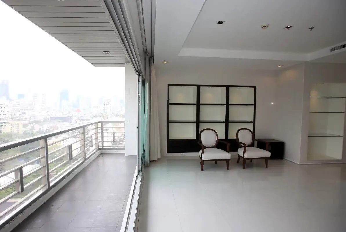This is a duplex 4 bedroom, 4 bathroom property available to rent at Royal Residence Park near Bangkok's Lumphini Park. The condo measures a spacious 385 sqm., is situated on the 12th floor and comes fully furnished. There is a large balcony, store room, maid's quarters and pleasant view. Royal Residence Park has a swimming pool, gym, playground, tennis court, sauna, parking and security service.