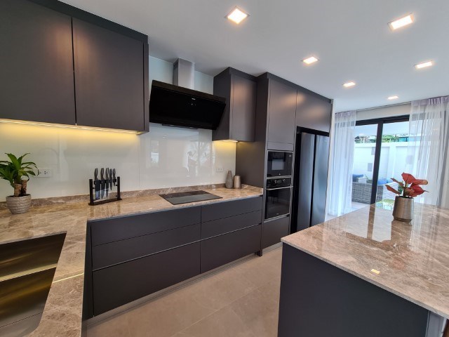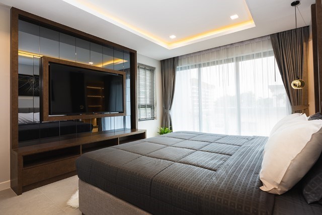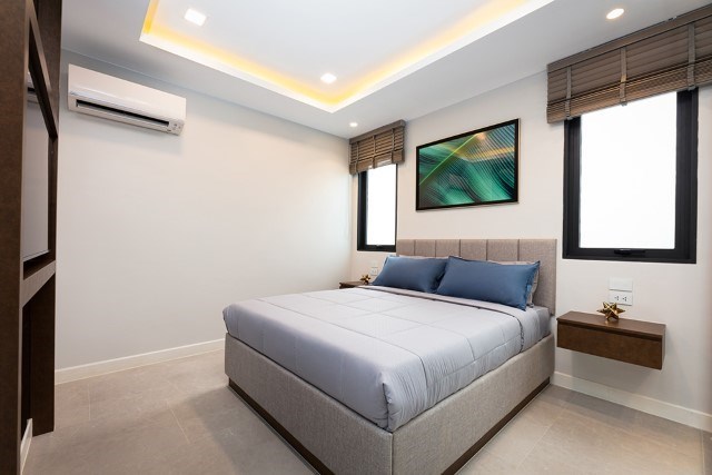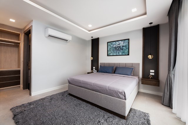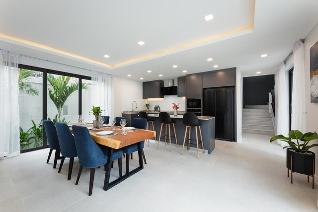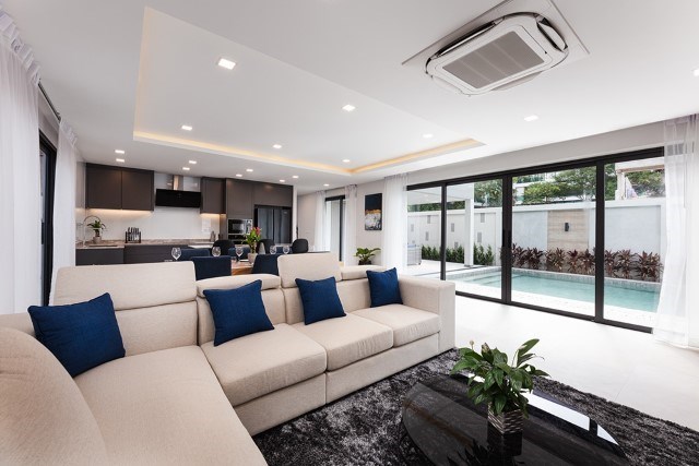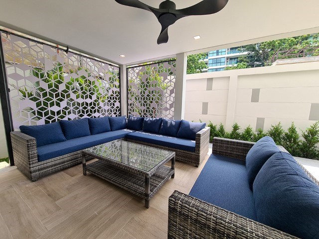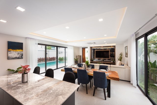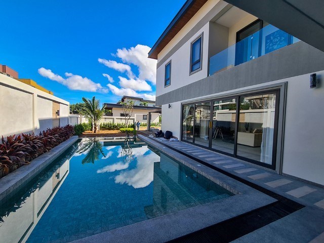 Luxury pool villa with large swimming pool (10x5 m) , double garage, land size 420 Sqm (105 TW), living area 290 sqm, fully furnished, European Kitchen, walk-in wardrobes, 4 bedrooms, 5 bathrooms, 24 hour security, located at Jomtien area, close to market, restaurant, massage shop, Jomtien Beach
