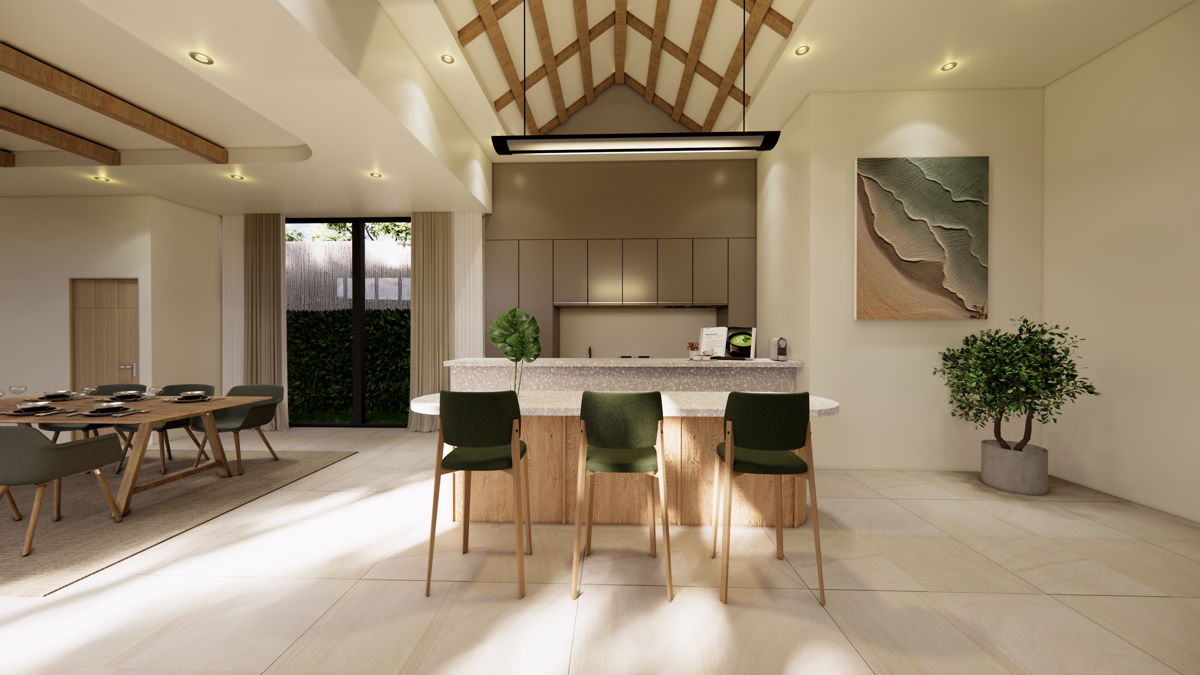 — Spacious open plan living & dining areas with high vaulted ceiling in living area