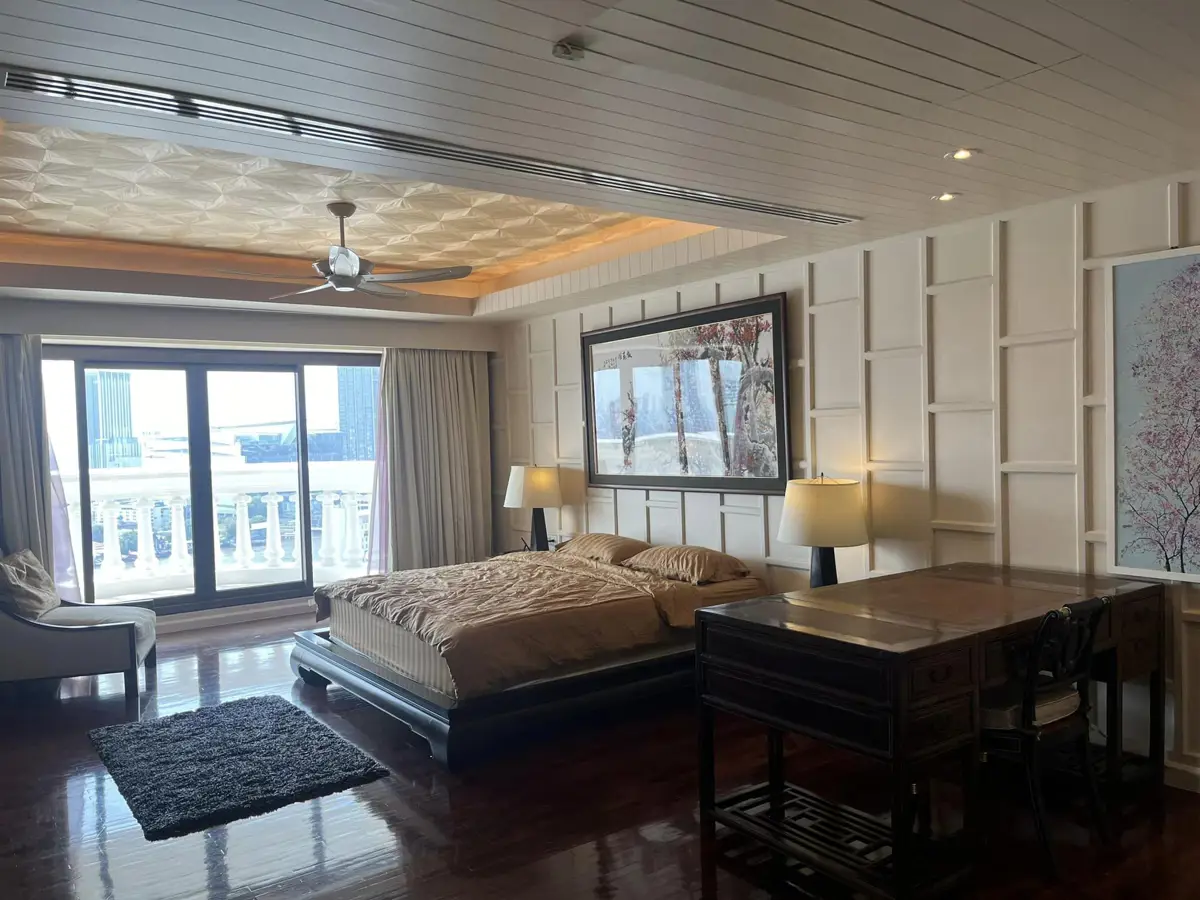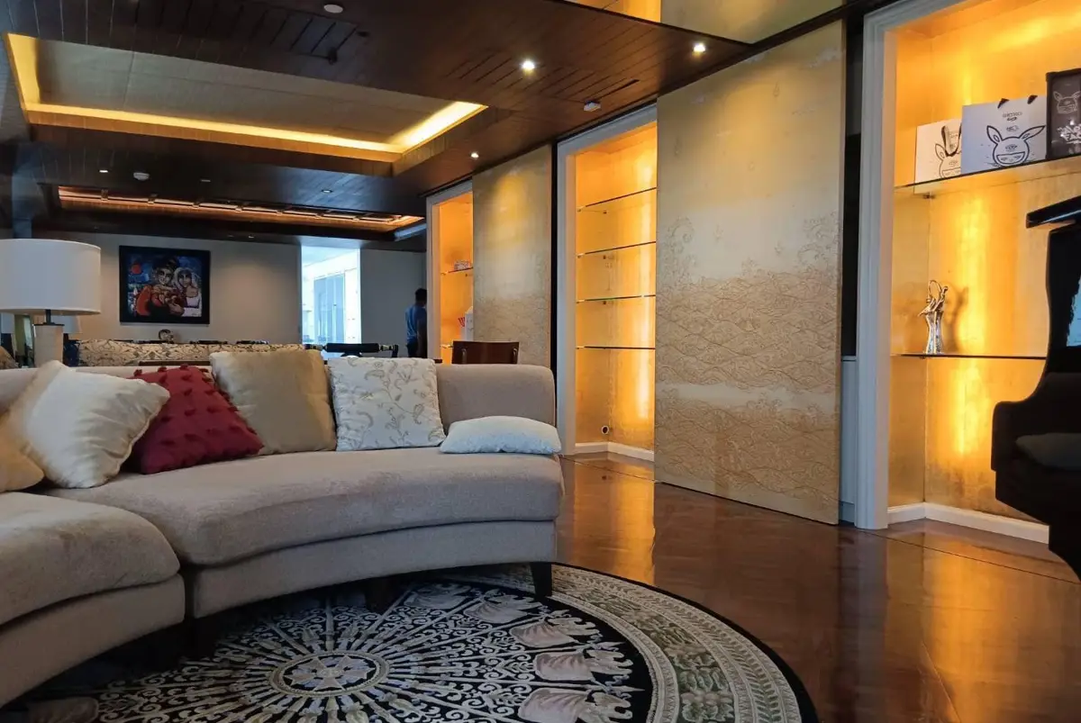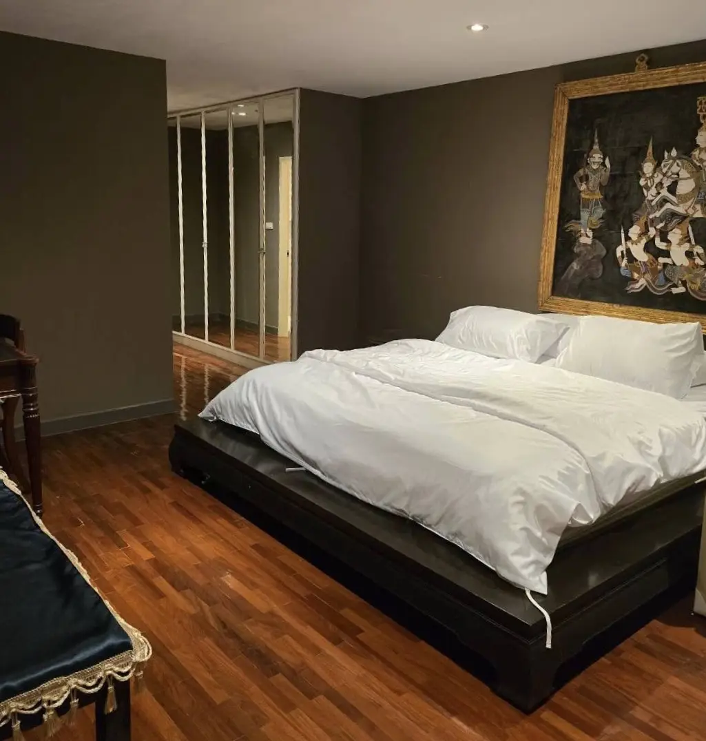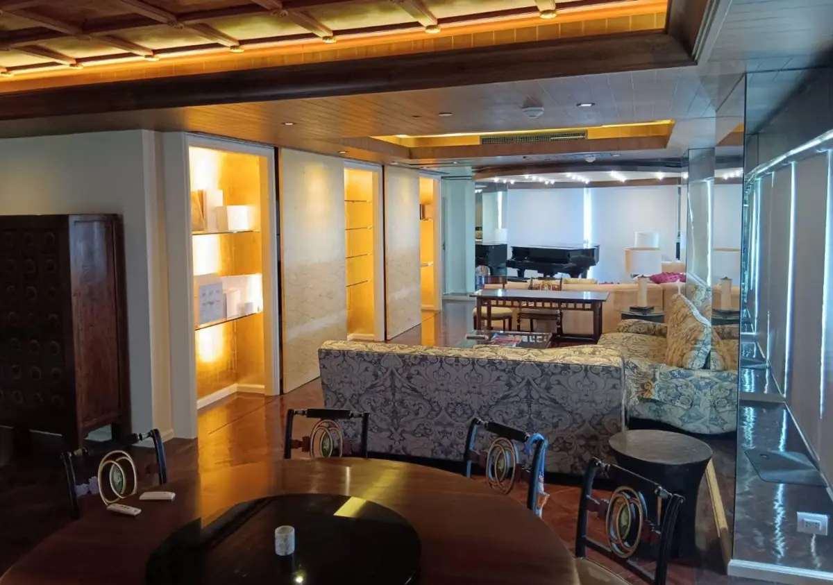 Welcome to this exceptional two-bedroom condo for rent in Bangkok, located on the 18th floor and offering breathtaking sky and horizon views. Spanning an impressive 267 square meters, this uniquely designed residence features a sophisticated Thai art studio aesthetic that blends culture with modern luxury.