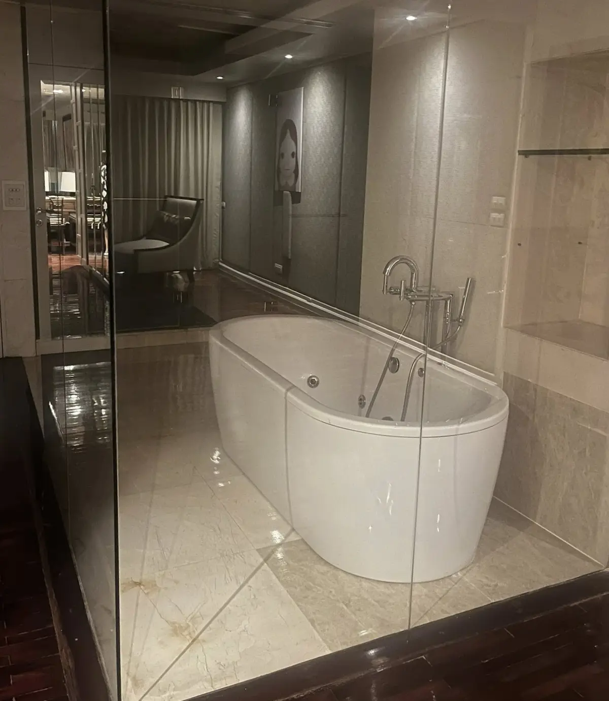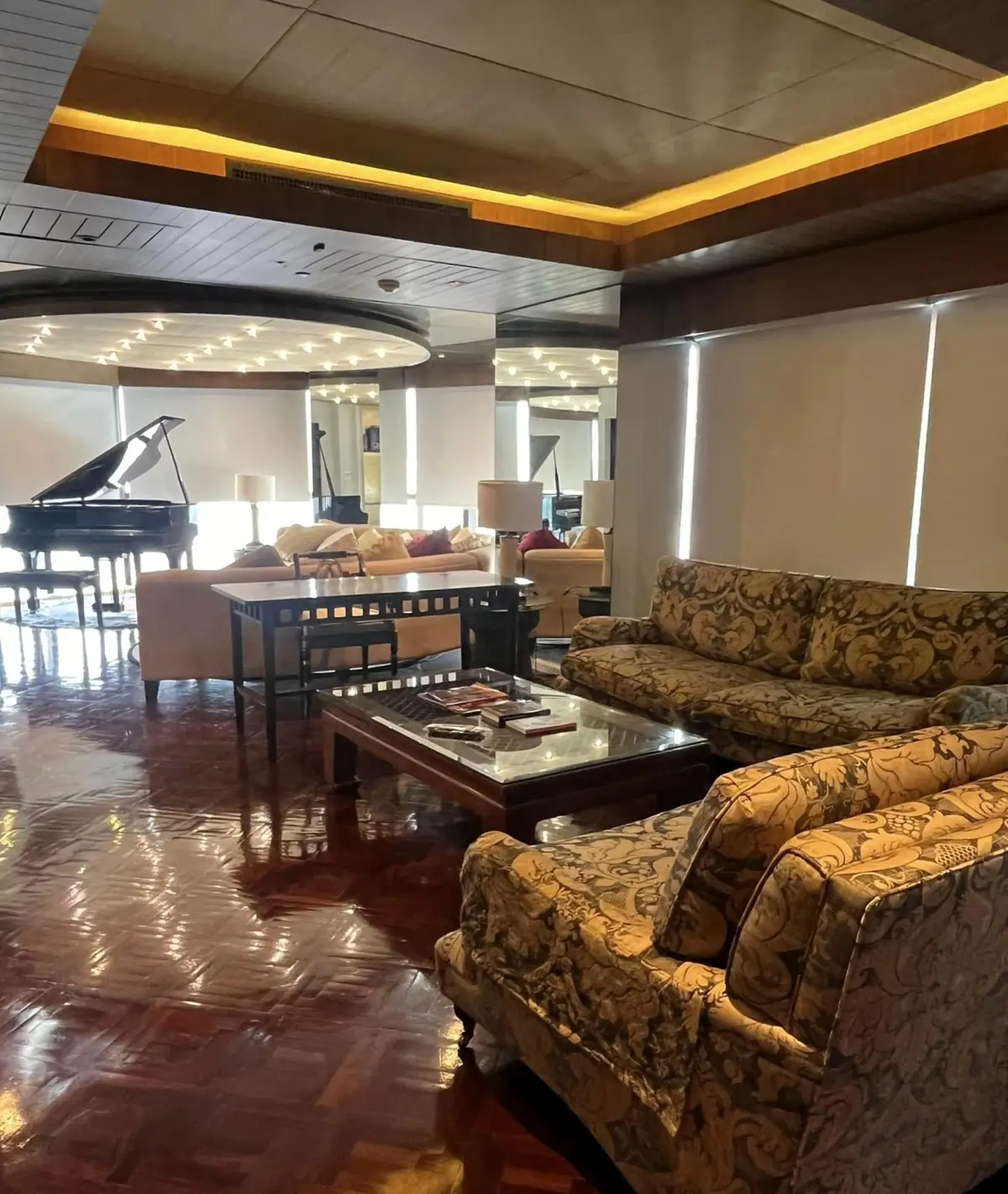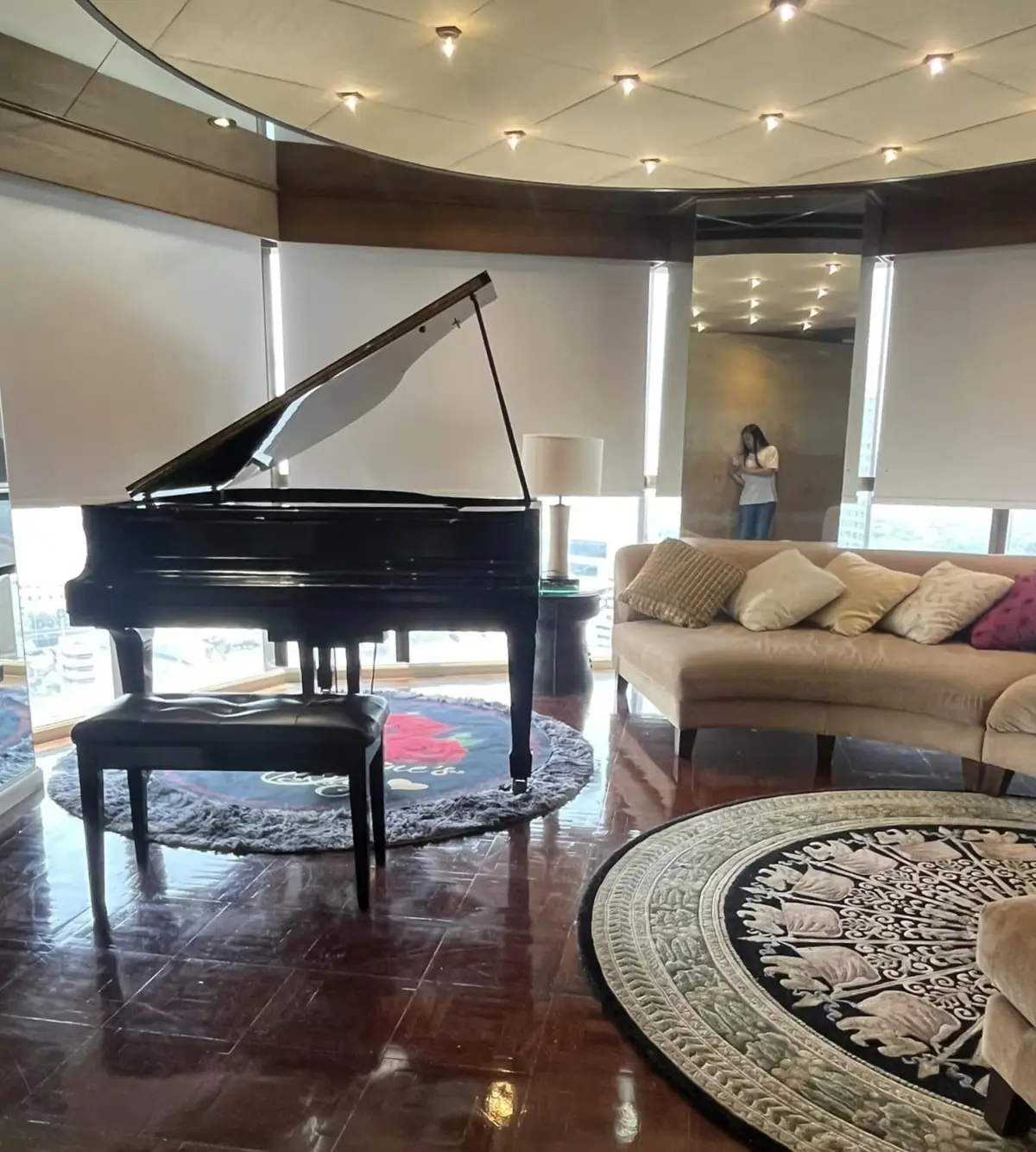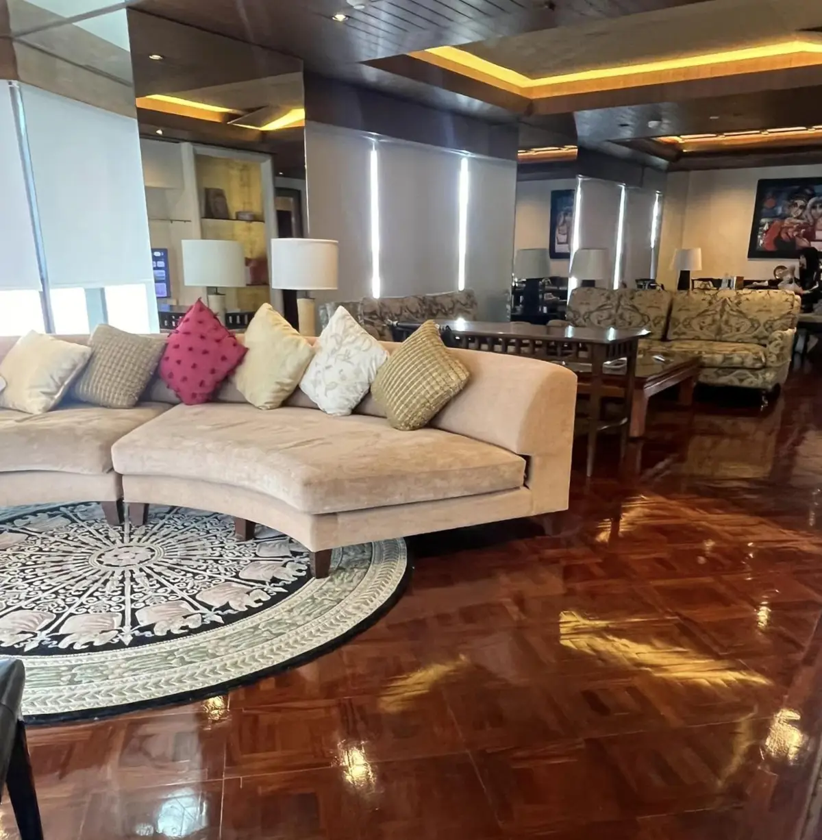 The condo includes two spacious bedrooms and two elegant bathrooms, one of which is a “sexy” bathroom outfitted with a relaxing Jacuzzi tub. A grand, open-concept living and dining area provides the perfect setting for a large family or entertaining guests. The circular sectional couch and floor-to-ceiling windows create a bright, airy atmosphere and showcase stunning views from every angle.
