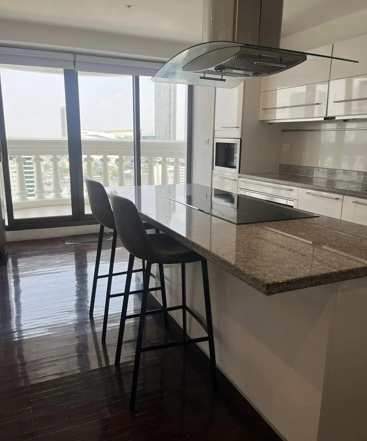 Five private balconies offer uninterrupted river vistas, making this home a true sanctuary above the city. The fully equipped kitchen is both stylish and functional, featuring a central island, abundant storage, a large wine cellar, a built-in oven, and a dishwasher for added convenience.