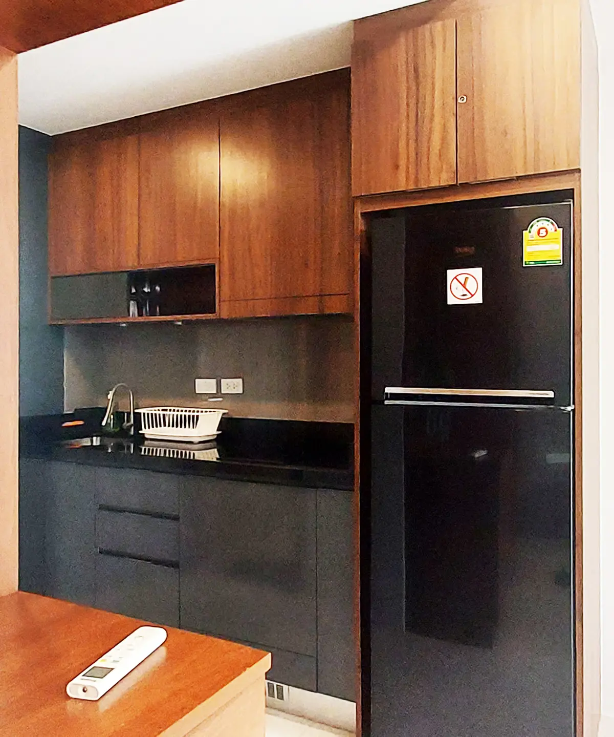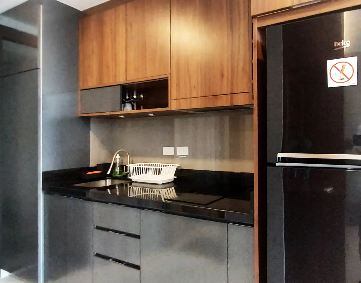 The condo is fully furnished and equipped with AC, fridge and freezer, 2-burner stove, microwave, other necessary kitchen equipment, and TV. The total living area is 39.79 sq m.